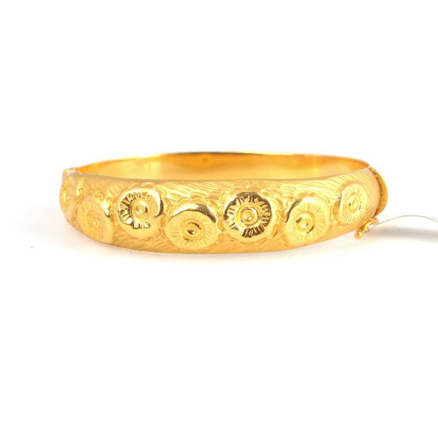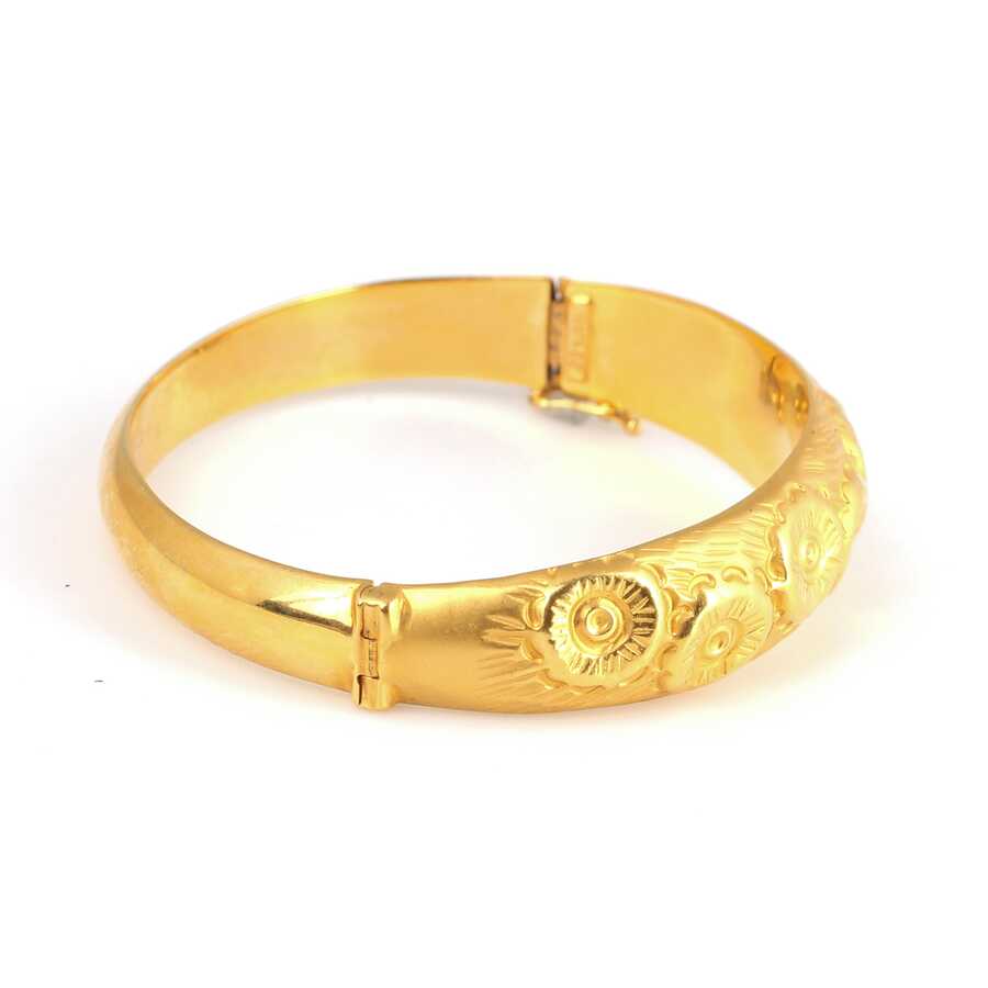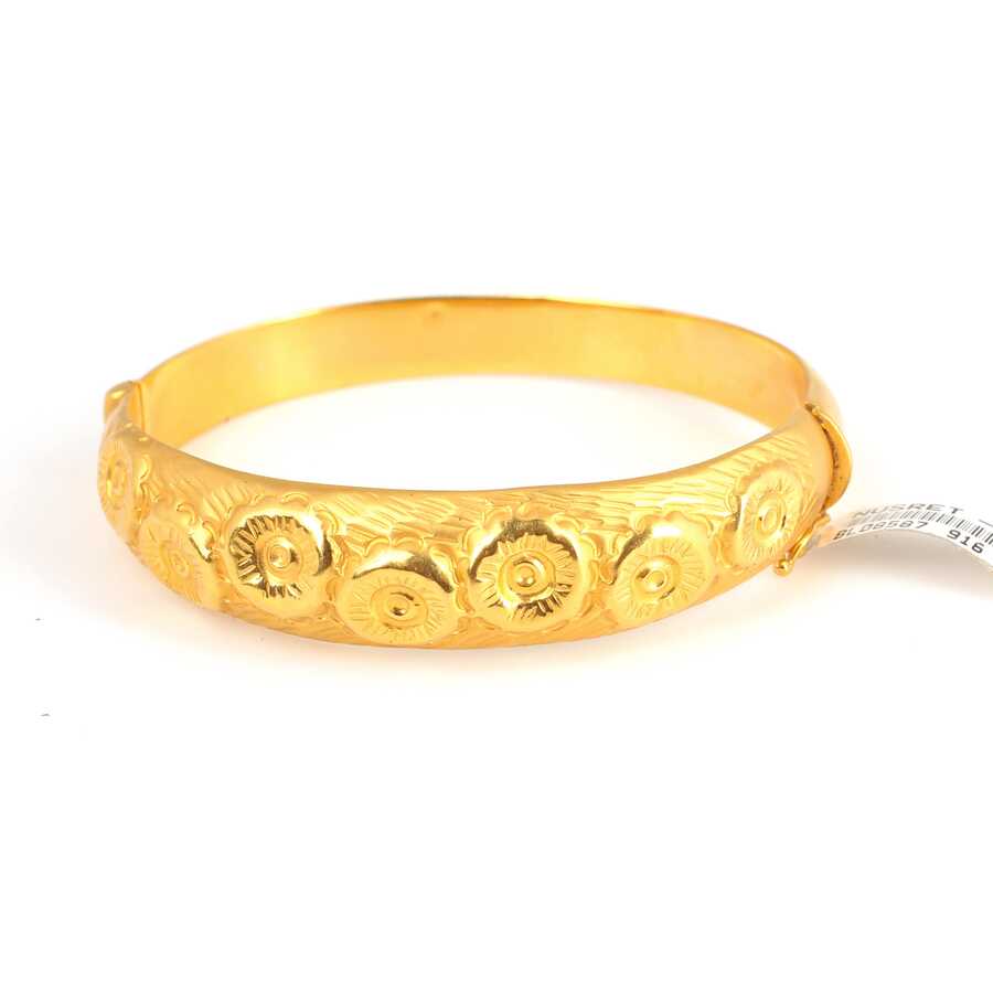 Bilezik 22 ayar altından imal edilmiştir. Kakma gül model bilezik 6,2 cm çapındadır. Bilezik 1,5 cm enindedir. Bilezik taşsızdır. Bilezik 25,87 gram ağırlığındadır.