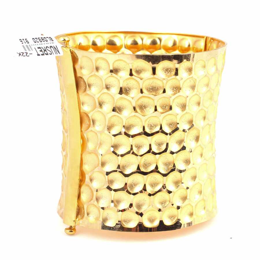 Bilezik 22 ayar altından imal edilmiştir. Kalın bal peteği model bilezik 6,3 cm çapındadır. Bilezik 6,9 cm enindedir. Bilezik taşsızdır. Bilezik çift kilitlidir. Ağırlığı 77,17 gramdır.