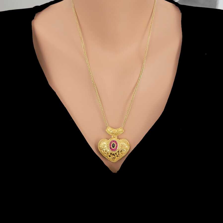 Altın kolye ucu 22 ayar altından üretilmiştir. Taşlı kalp kolye ucu tepelik dahil 3,0 cm'ye 3,3 cm boyutlarındadır. Kolye ucu üzerinde yakut ve safir taşlıdır. Ağırlığı 13,71 gramdır.
