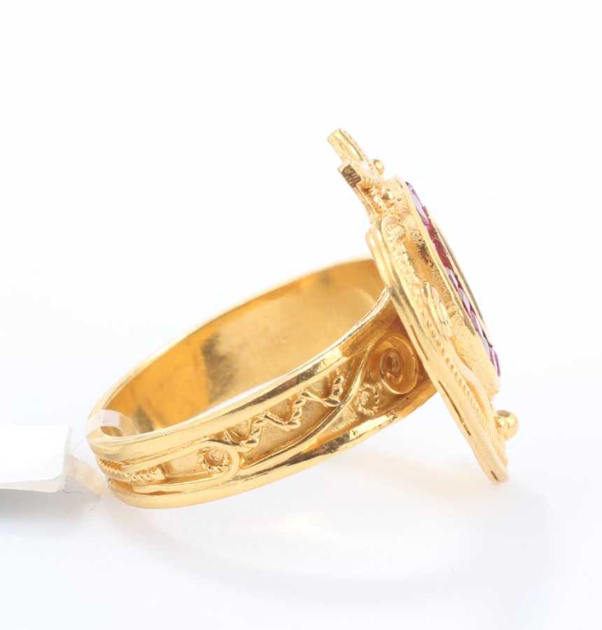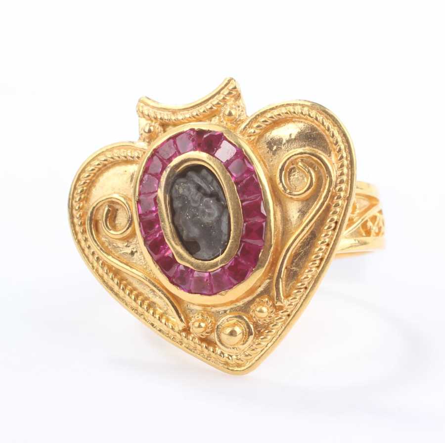 22 Ayar Altın Kalpli Yakut Taşlı Madalyon Yüzük