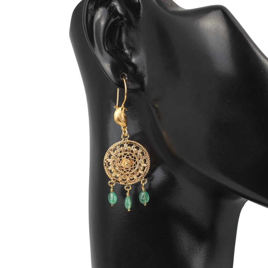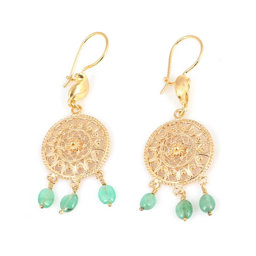 22 Ayar Altın Kubbe Motifli Zümrüt Sallantılı Telkari Küpe