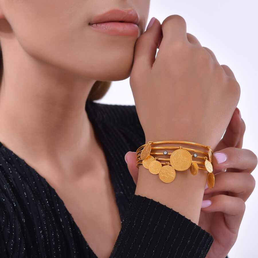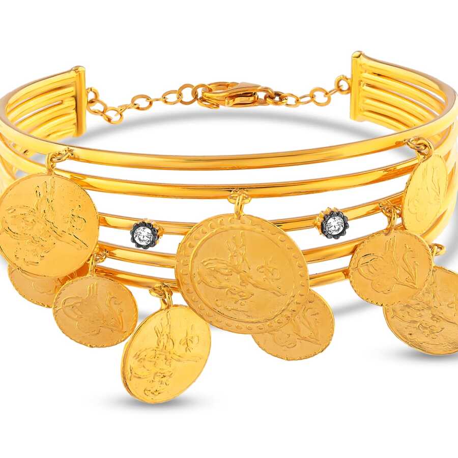 Bilezik 22 ayar altından imal edilmiştir. Mahmudiye paralı tel bilezik 5,9 cm çapındadır. Bilezik 1,8 cm enindedir. Altın paralı parçalardan oluşan tellerin üzerine monte edilerek tasarlanan bileziktir. Bilezik zirkon taşlıdır. Bilezik 34,5 gram ağırlığındadır.