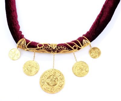 22 ayar altındır. Mahmudiye paralı ve telkâri parçalardan oluşan kadife kordonlu antik kolyedir. Kolyenin uzunluğu: 61 cm Gramı 42,25 gr