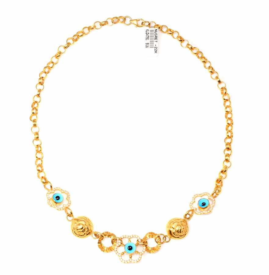 Altın kolye 22 ayar altından üretilmiştir. Nazar boncuklu model kolye 6 cm boyutlarındadır. Altın kolye 52 cm uzunluğundadır. Nazar boncuklu parçalar ile zincirlerin aralarında el işi gül motifli kakma model parçalar eklenmiştir. Kolye signyt zirkon taşlıdır. Ağırlığı 37,49 gramdır. Verilen gramlar yaklaşıktır, değişebilir.