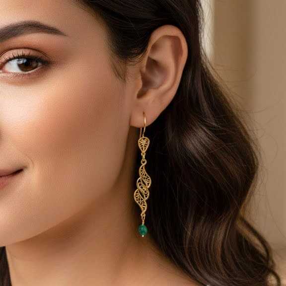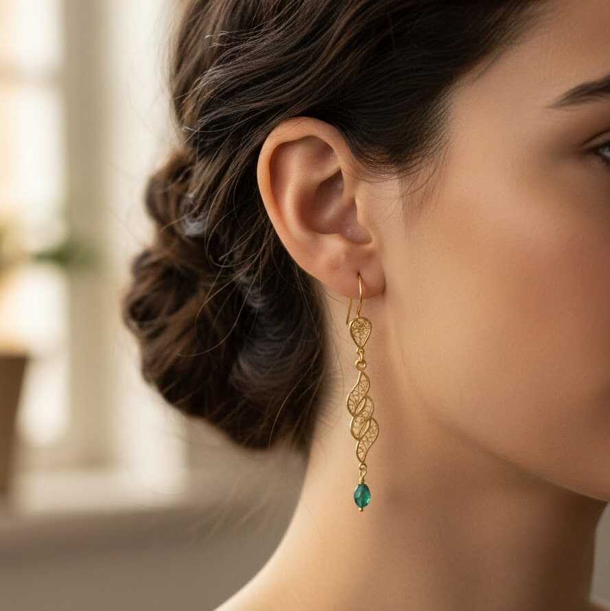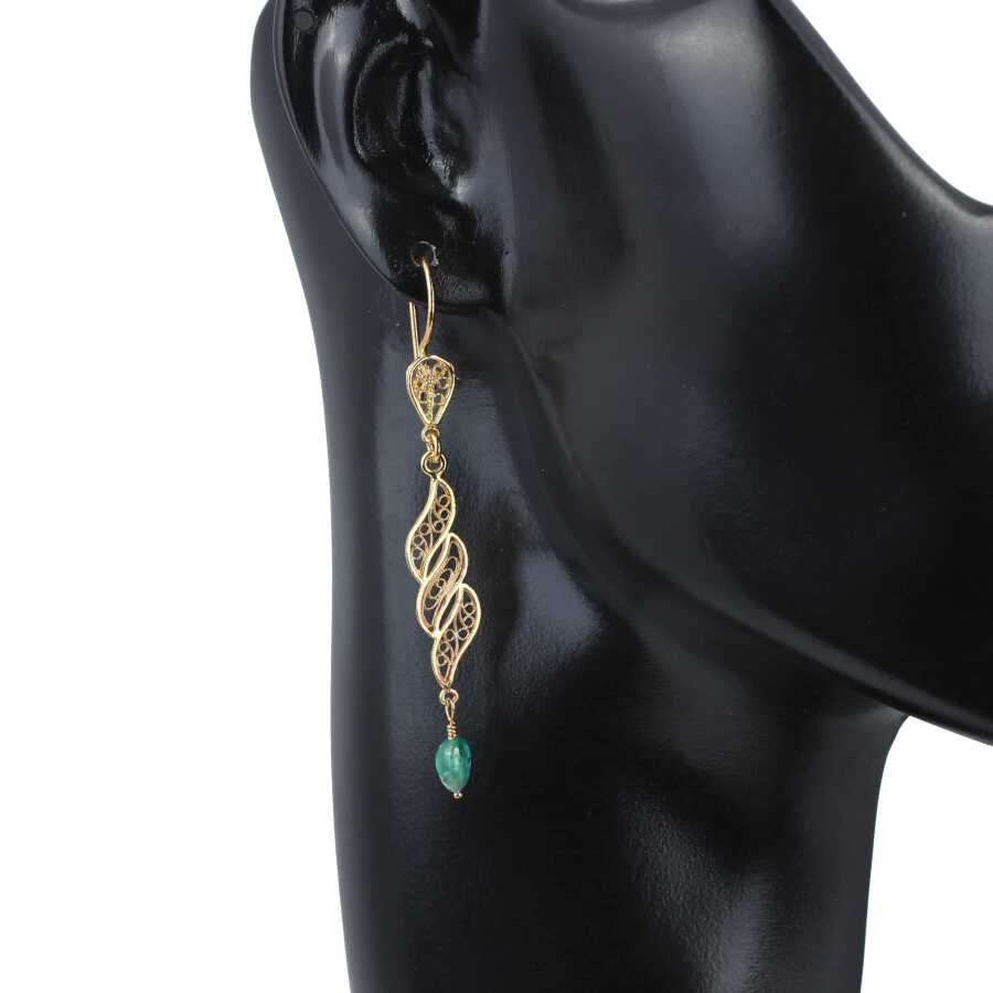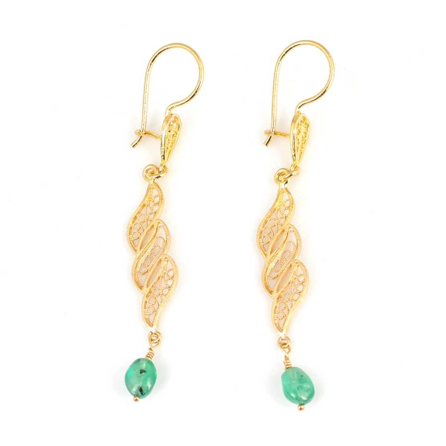 22 Ayar Altın Sarmaşık Yaprak Motifli Zümrüt Sallantılı Telkari Küpe