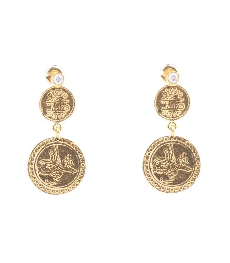 Altın küpe 22 ayar altından üretilmiştir. Sallantılı mahmudiye paralı model küpe 3,7 cm uzunluğundadır. Küpe zirkon taşlıdır. Taş yuvası altında 2 adet mahmudiye paralardan oluşur. Ağırlığı 7,45 gramdır. Verilen gramlar yaklaşıktır, değişebilir.