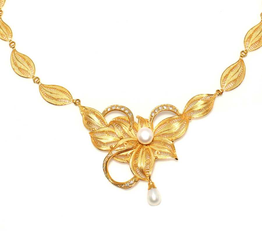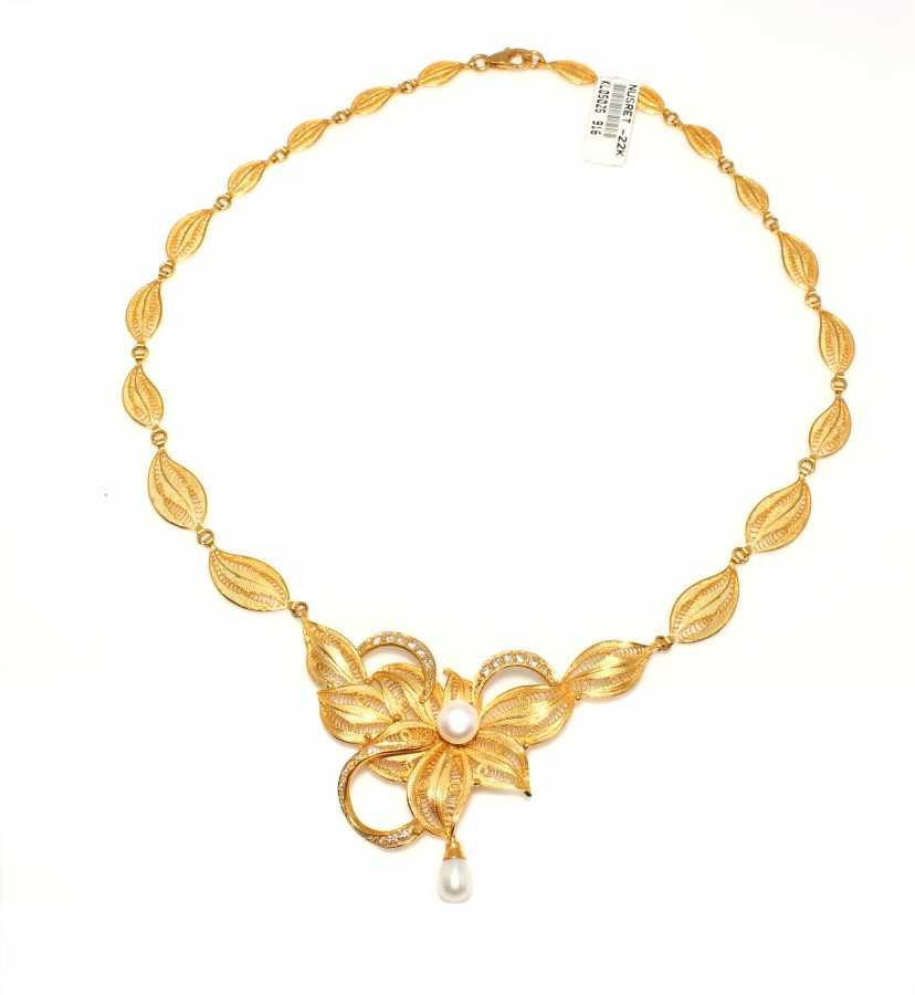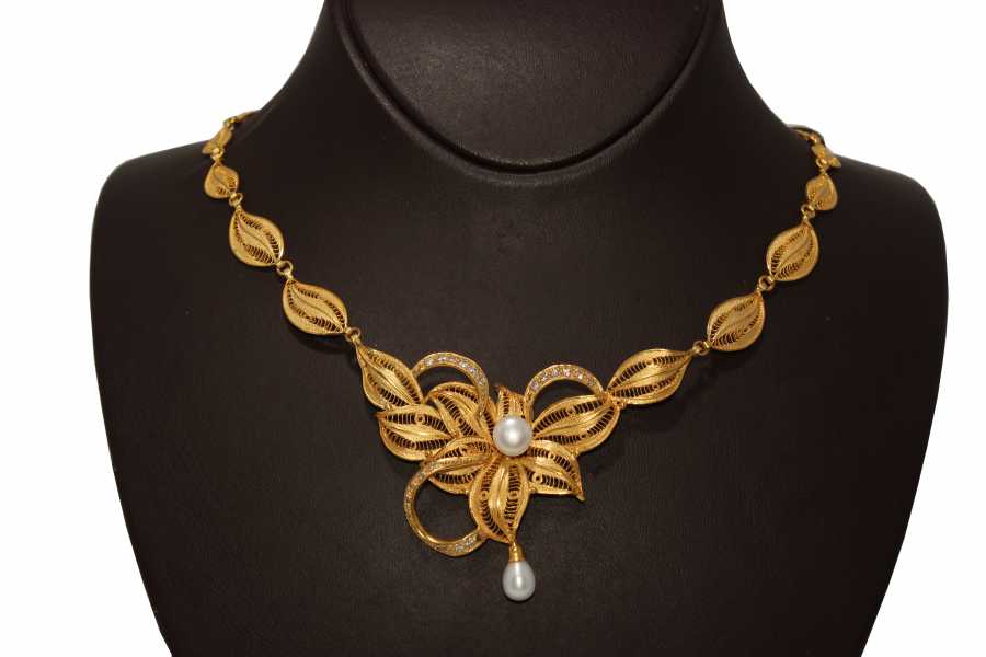 Altın kolye 22 ayar altından üretilmiştir. Telkari model kolye 7,0 cm'ye 5,5 cm boyutlarındadır. El işi altın kolye 40 cm uzunluğundadır. Kolye signyt zirkon taşlıdır. Ağırlığı 45,02 gramdır. Verilen gramlar yaklaşıktır, değişebilir.
