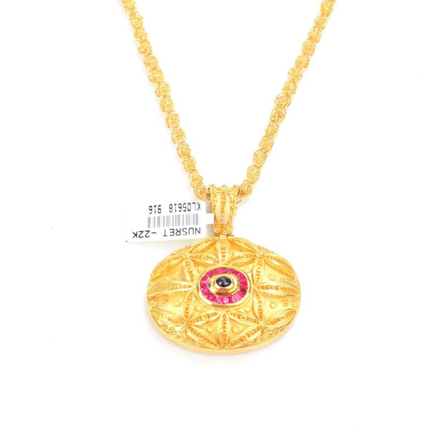 Notify me when its in stock Altın kolye 22 ayar altından üretilmiştir. Antik telkari model kolye 4,0 cm'ye 4,5 cm boyutlarındadır. Güllü zincir 50 cm uzunluğundadır. Kolye safir ve yakut taşlıdır. Ağırlığı 48,39 gramdır. Verilen gramlar yaklaşıktır, değişebilir.