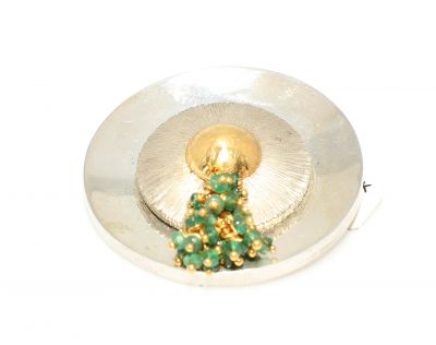 925 ayar gümüş ve 22 ayar altının bir arada kullanılmasıyla hazırlanan kolye ucudur. Şapka şeklinden esinlenilen kolye ucu 4,5 cm boyutlarındadır. Kolye ucu içi boş astardan iç bükey olarak tasarlanmıştır. Zincirin dahil olmadığını lütfen unutmayın. Kolye ucu zümrüt taşlıdır. Kolye ucu 2,35 gramdır.