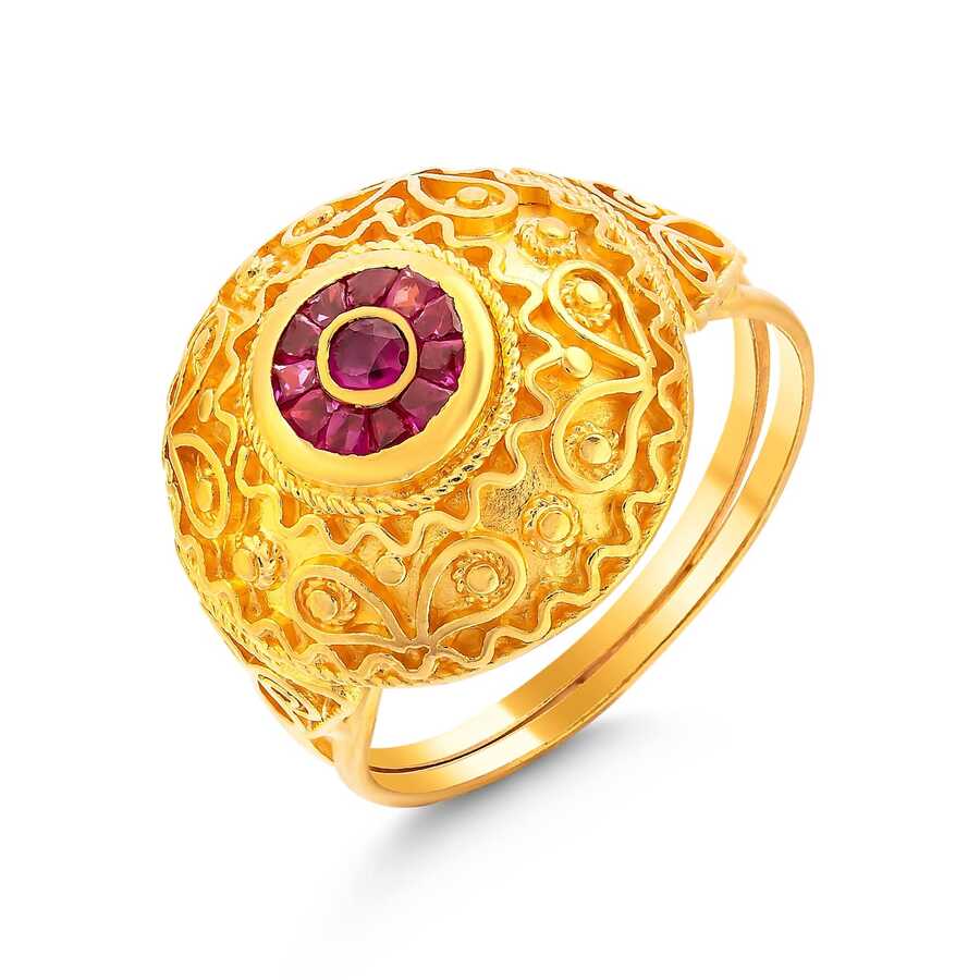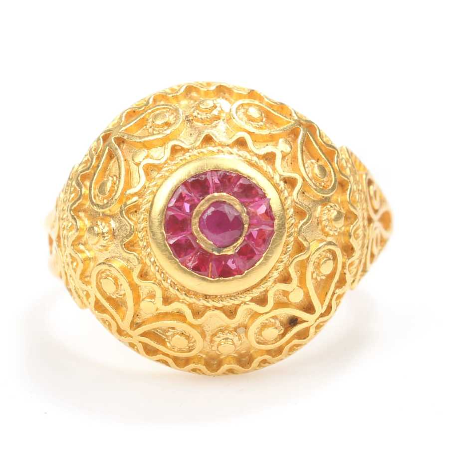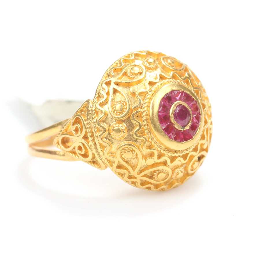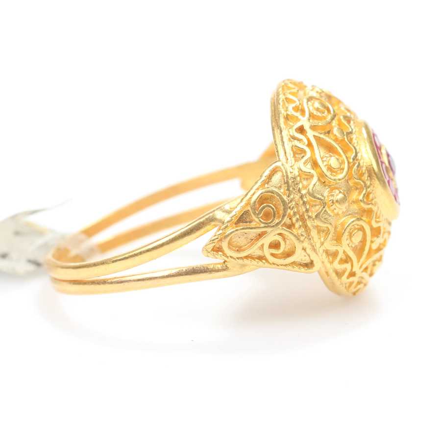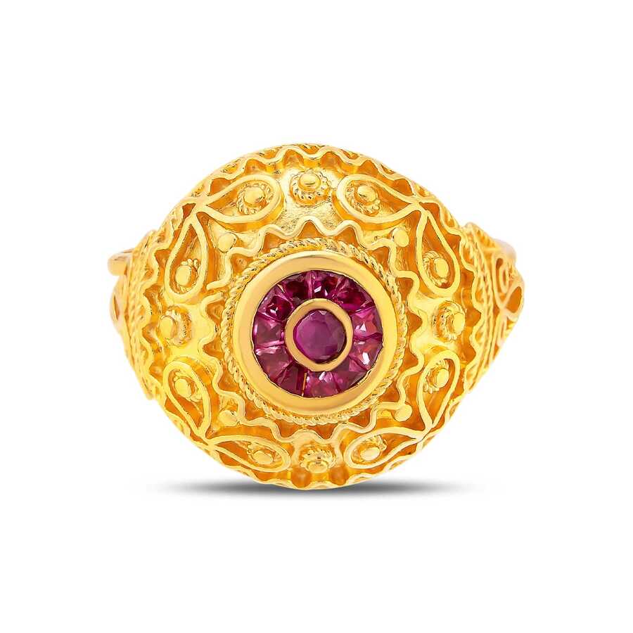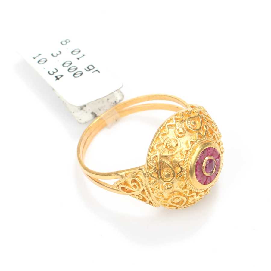 Yüzük 22 ayar altından üretilmiştir. Antik model yüzük 24 ölçüdür. Tüm ölçüler yapılabilmektedir. Yüzüğün üst kısmı 1,8 cm boyutlarındadır. Yüzük yakut taşlıdır. Ağırlığı 8,1 gramdır.