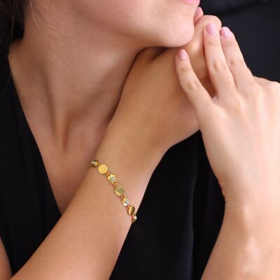 Bileklik 22 ayar altından imal edilmiştir. Yonca model çocuk bileklik 18 cm uzunluğundadır. Yoncalı taşlı şeklinde ve düz yuvarlak plakalardan oluşan zincirli bilekliktir. Bileklik turkuaz taşlıdır. El işi bileklik 10,35 gram ağırlığındadır.