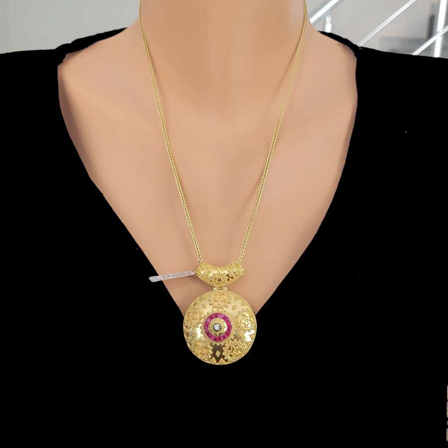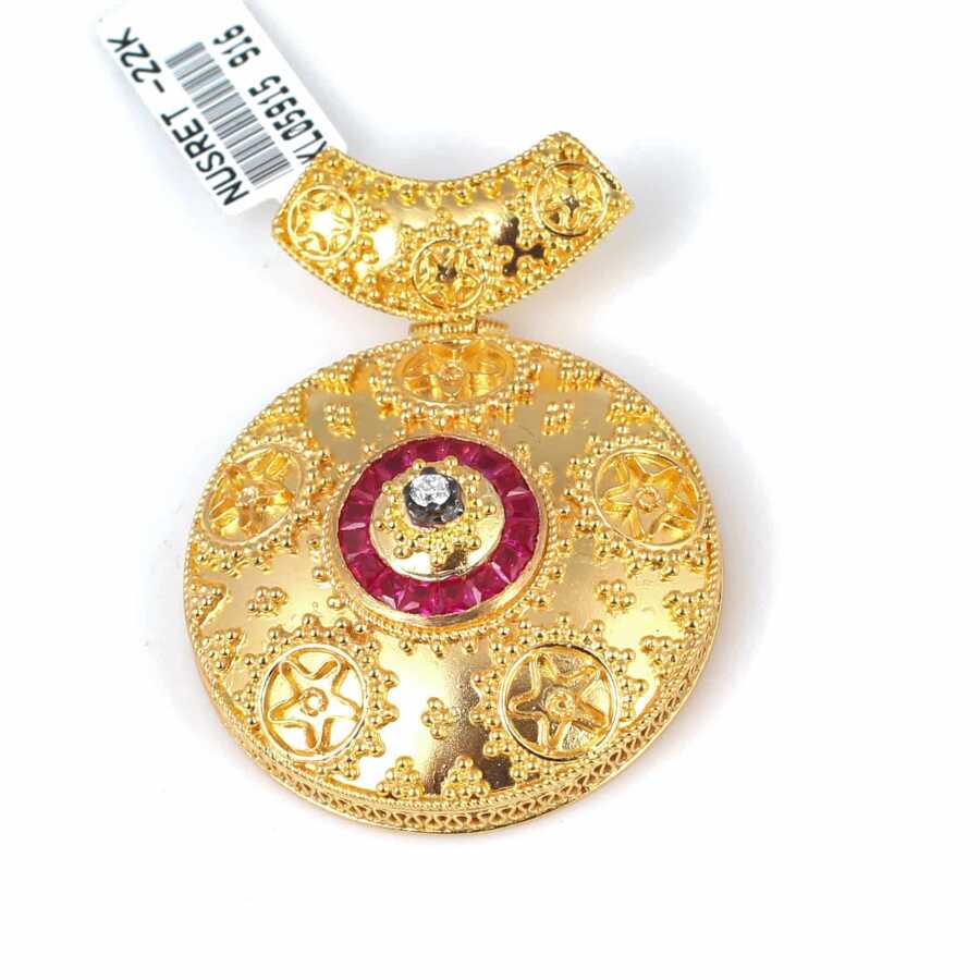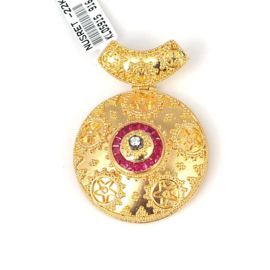 Altın kolye ucu 22 ayar altından üretilmiştir. Taşlı kolye ucu tepelik dahil 4,5 cm'ye 3,7 cm boyutlarındadır. Kolye ucu üzerinde yakut ve 0,15 crt pırlanta taşlıdır. Ağırlığı 24,41 gramdır.