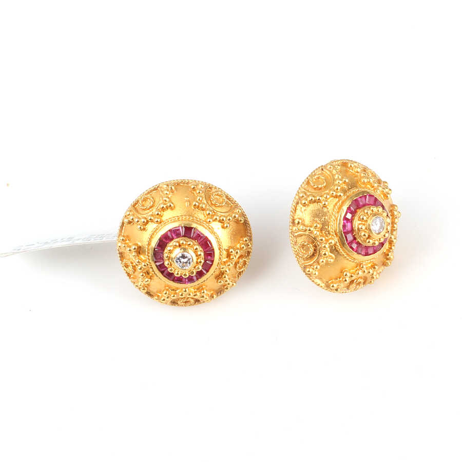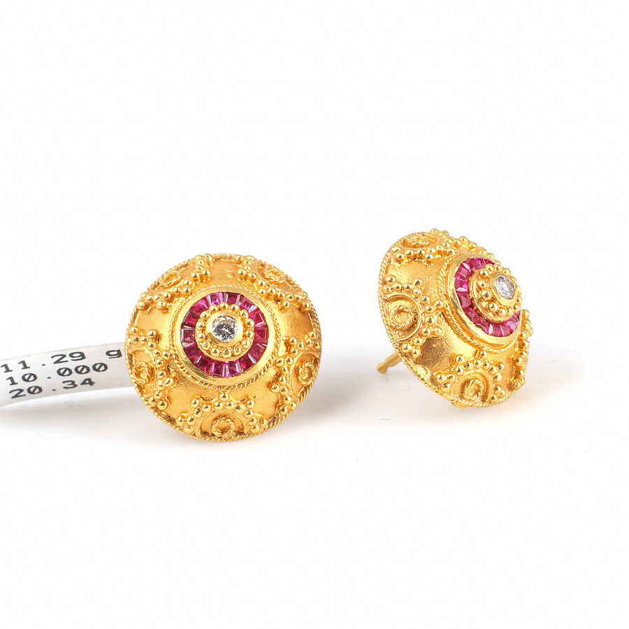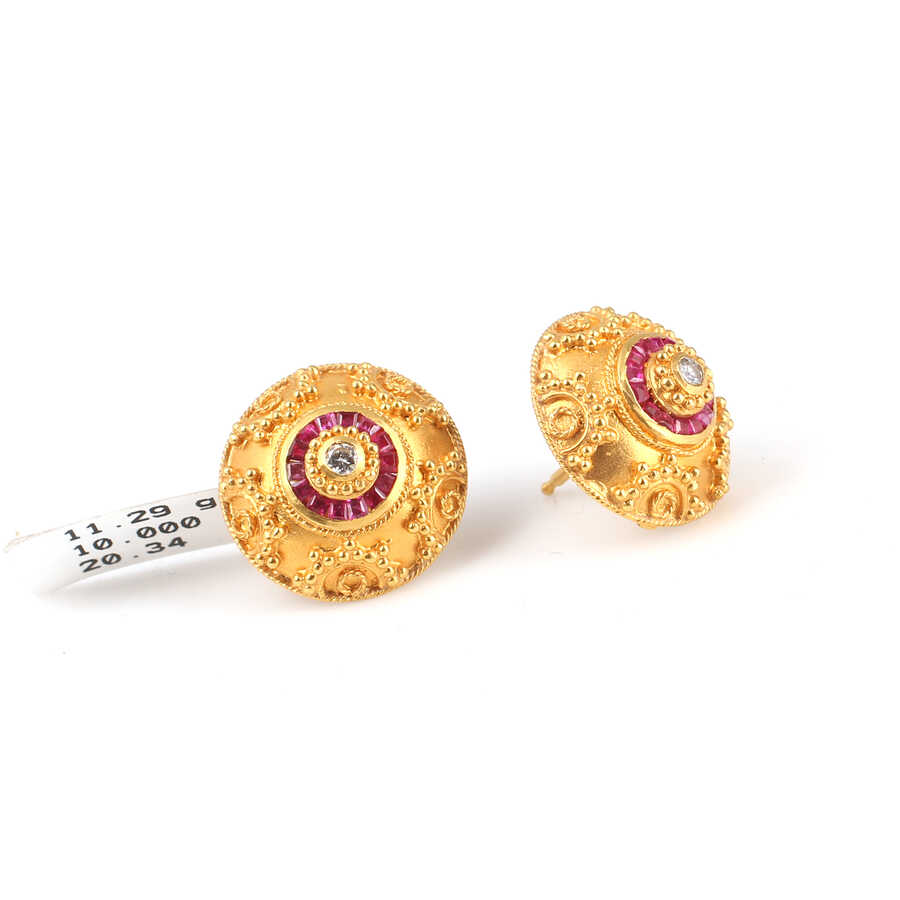 Altın küpe 22 ayar altından üretilmiştir. Yuvarlak model küpe 1,9 cm boyutlarındadır. El işi antik küpe pırlanta ve yakut taşlıdır. Pırlanta taşları toplam 0,06 karattır. Ağırlığı 11,29 gramdır.