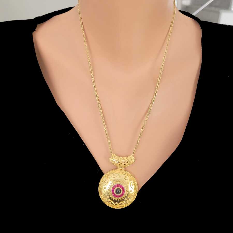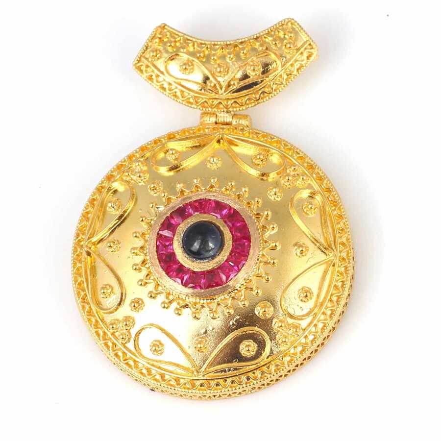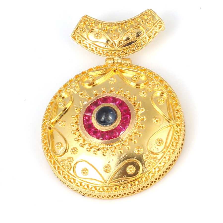 22 Ayar Altın Yuvarlak Yakut Ve Safir Taşlı Antik Kolye Ucu