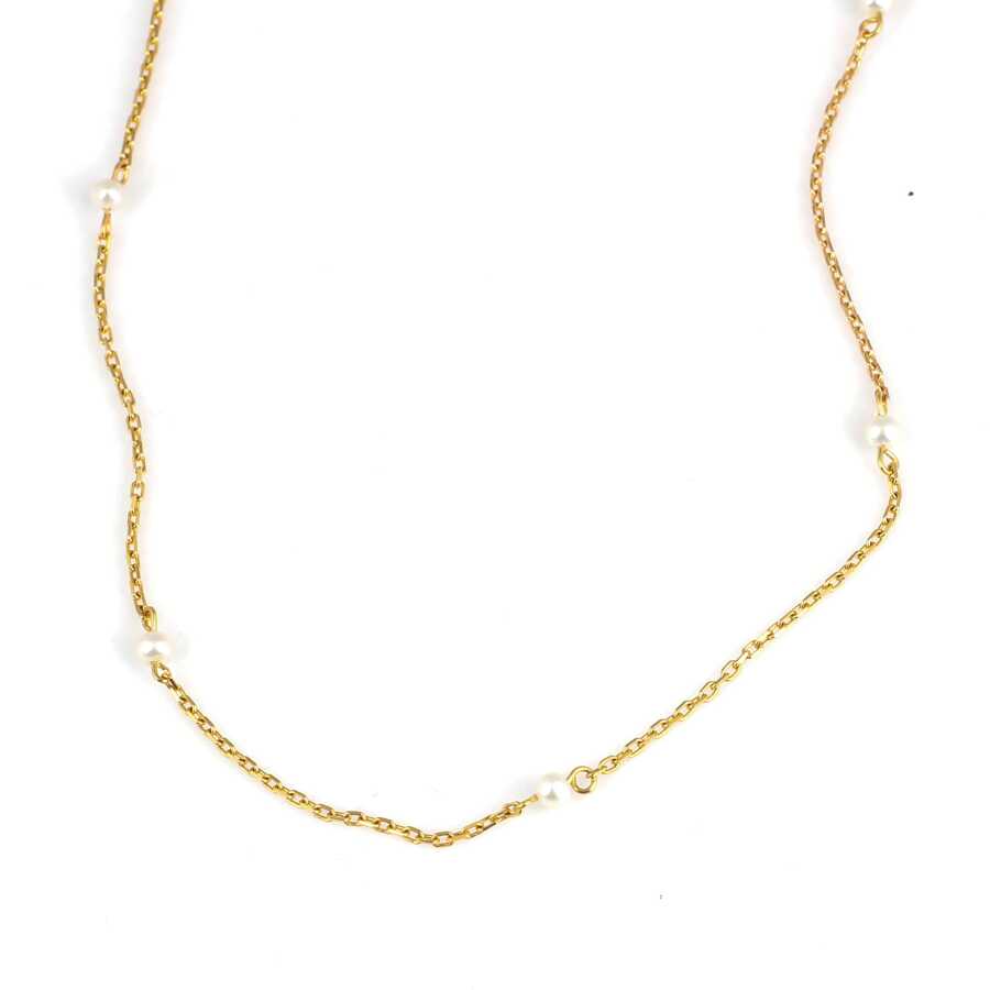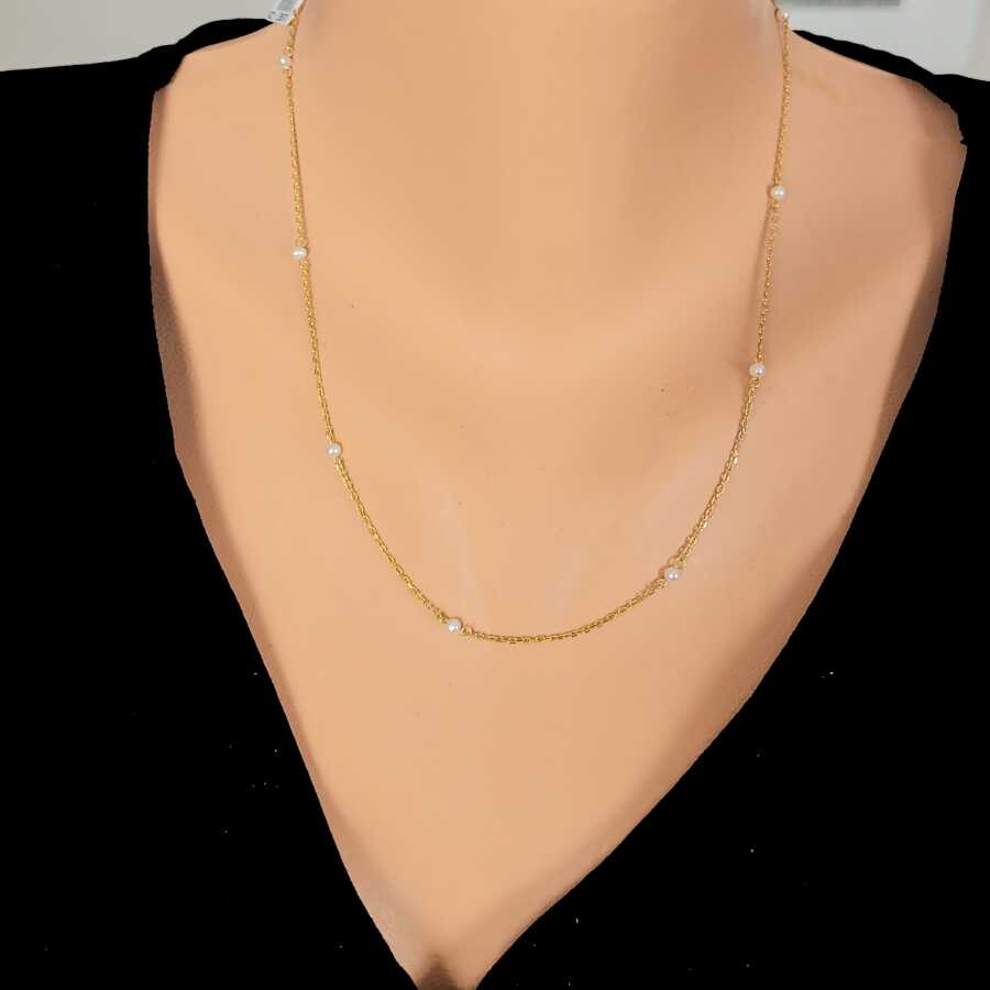22 ayar altındır. Kolye 45 cm uzunluğundadır. Zincir aralarında minik 0,3 cm boyutlarında inci taşlar mevcuttur. Ağırlığı 3,47 gramdır.