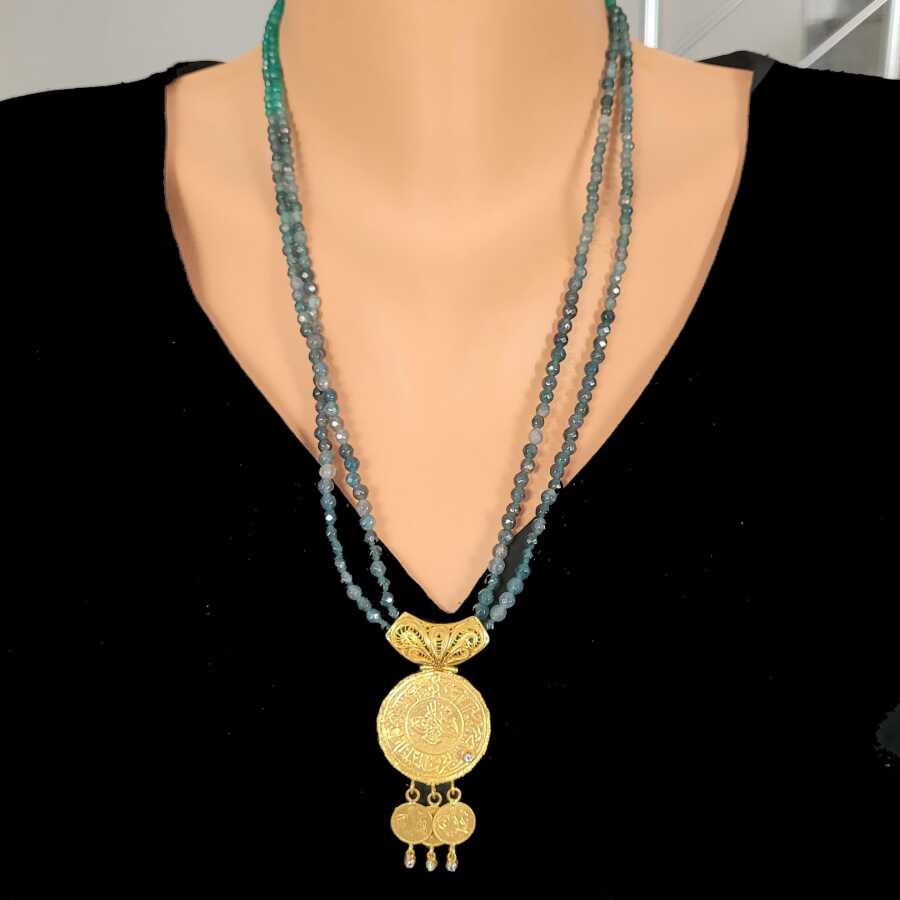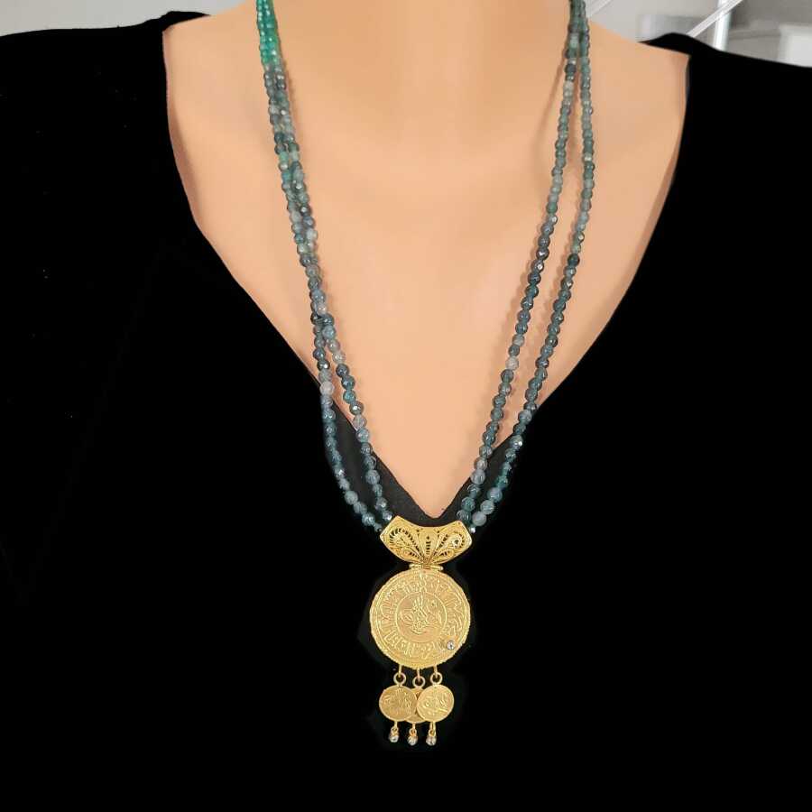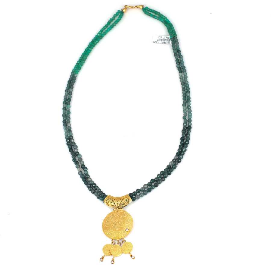 Notify me when its in stock Altın kolye 22 ayar altından üretilmiştir. 2 sıralı model kolye 55 cm uzunluğundadır. 2 sıra olarak dizilen kolyenin ucunda mahmudiye paraları eklenmiştir. Kolye ucu 6 cm uzunluğundadır. Kolye zümrüt ve zirkon taşlıdır. Ağırlığı 14,29 gramdır. Verilen gramlar yaklaşıktır, değişebilir.