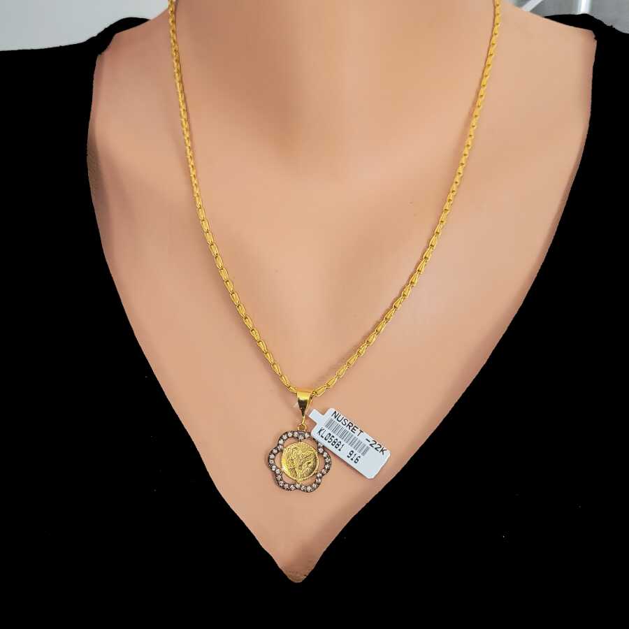 Gelince Haber Ver Kolye ucu 22 ayar altındır. Zincir dahil değildir. Papatya model kolye ucu tepelik dahil 2,9 cm 'ye 1,7 cm boyutlarındadır. Papatya figürü içinde Osmanlı Tuğrası figürü vardır. Osmanlı Tuğrası model kolye ucu zirkon taşlıdır. Kolye ucu 3,38 gram ağırlığındadır. Verilen gramlar yaklaşıktır, değişebilir.