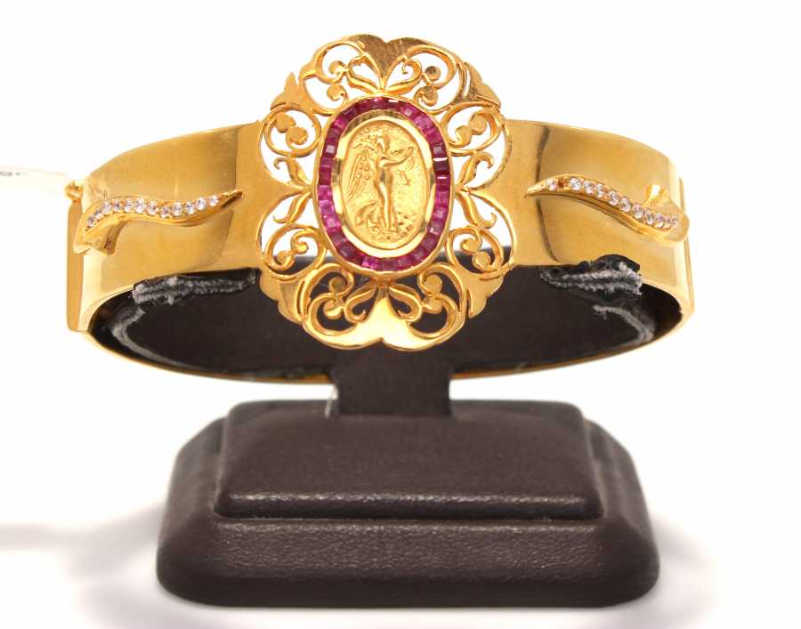 22 carat gold bangle bracelet, entourage ruby and fairy shape middle piece antique design bangle bracelet - Diameter: 6,1 cm Width:3,2 cm - Weight: 32,02 g