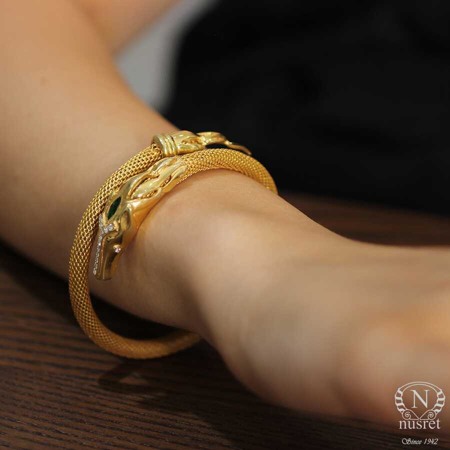 Bilezik 22 ayar altından imal edilmiştir. Yeleli at kafası model bilezik 6 cm çapındadır. Jessica zincirli bileziğin tepesinde at kafası 4,1 cm'ye 1,1 cm ve kuyruk kısmı 0,9 cm'ye 3,3 cm boyutlarındadır. Bilezik zirkon taşlıdır. Bilezik 54,6 gram ağırlığındadır.