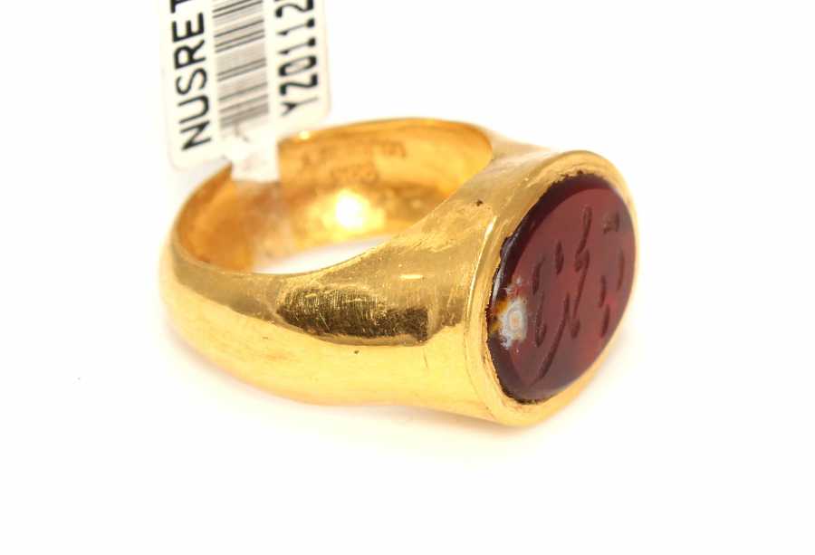 24 ayar altındır. 14 x1,4cm'dir. Akik taşlı yüzük Kenar kolu ile bütünleştirilmiştir üzeri yazılıdır. Gramı: 7,1