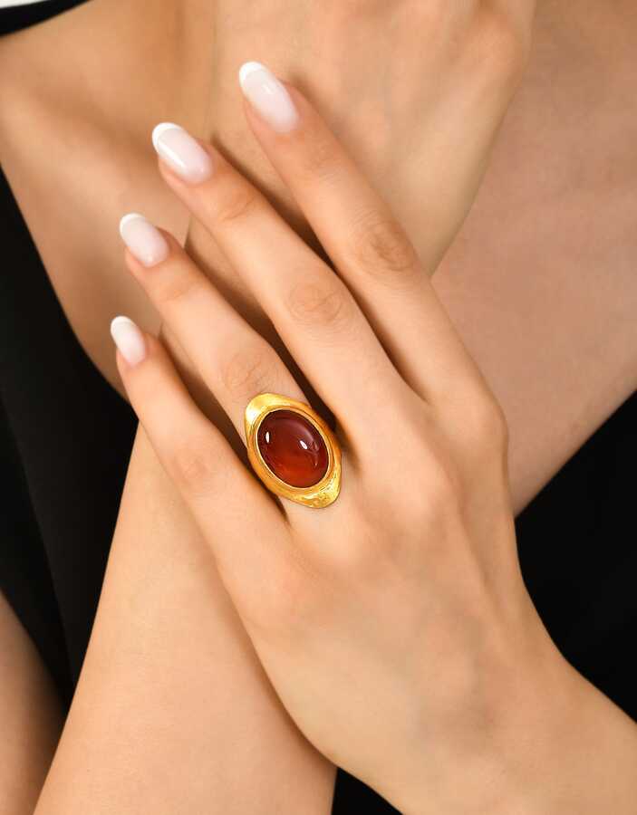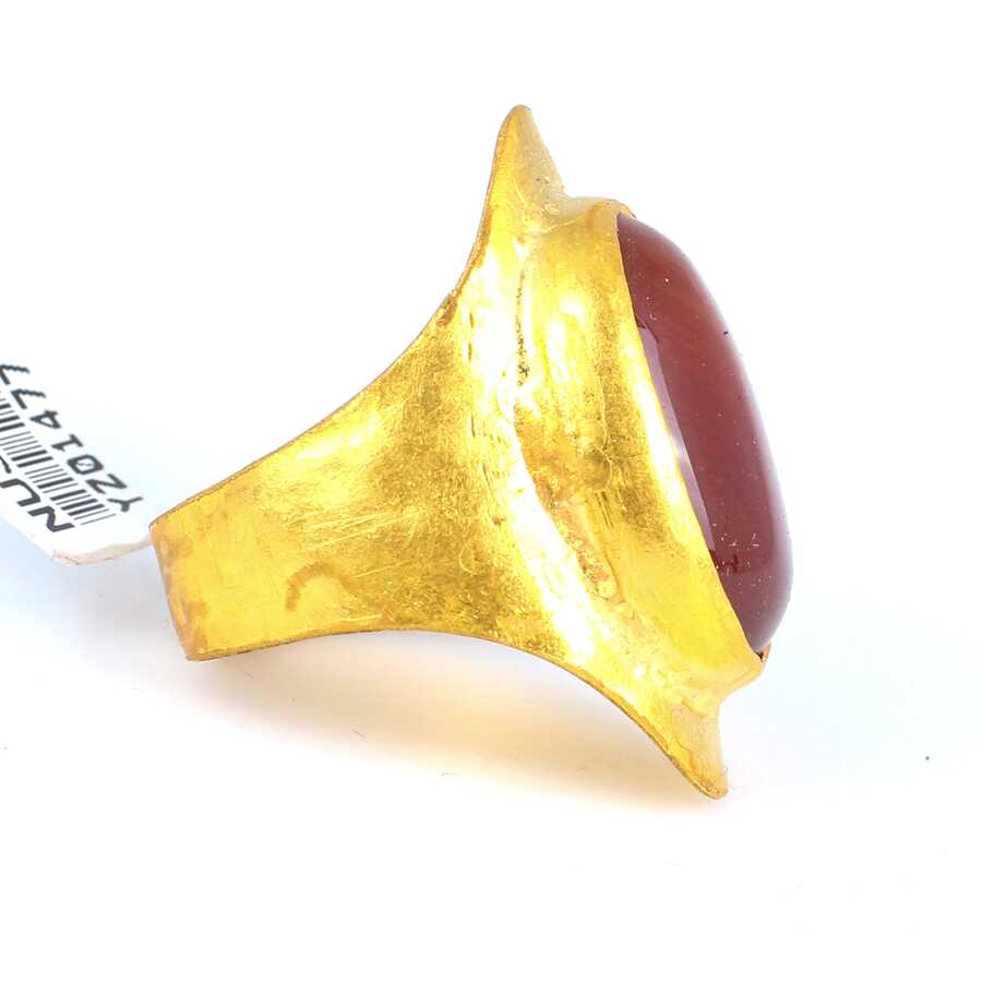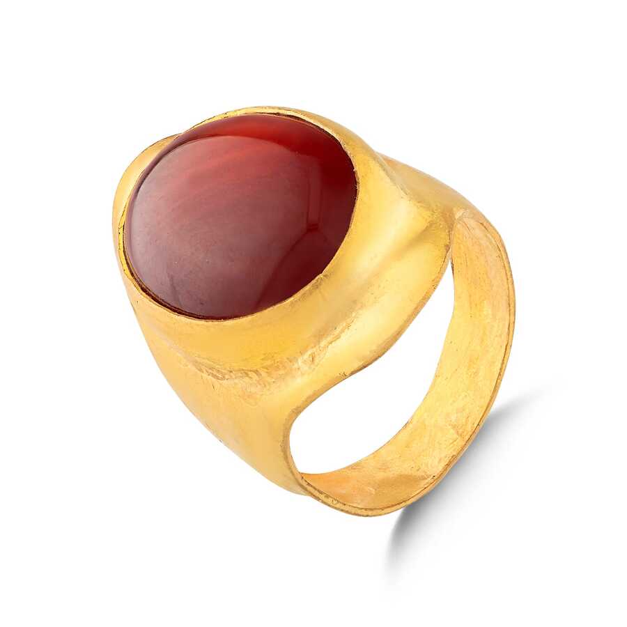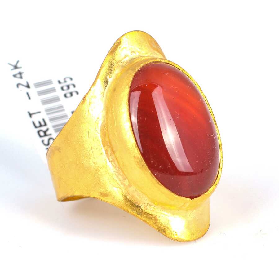 Yüzük 24 ayar altından üretilmiştir. El işi yüzük 17 ölçüdür. Tüm ölçüler yapılabilmektedir. 2,9 cm kalınlığındadır. Primitif dövmeli yüzük akik taşlıdır. Ağırlığı 12,71 gramdır.