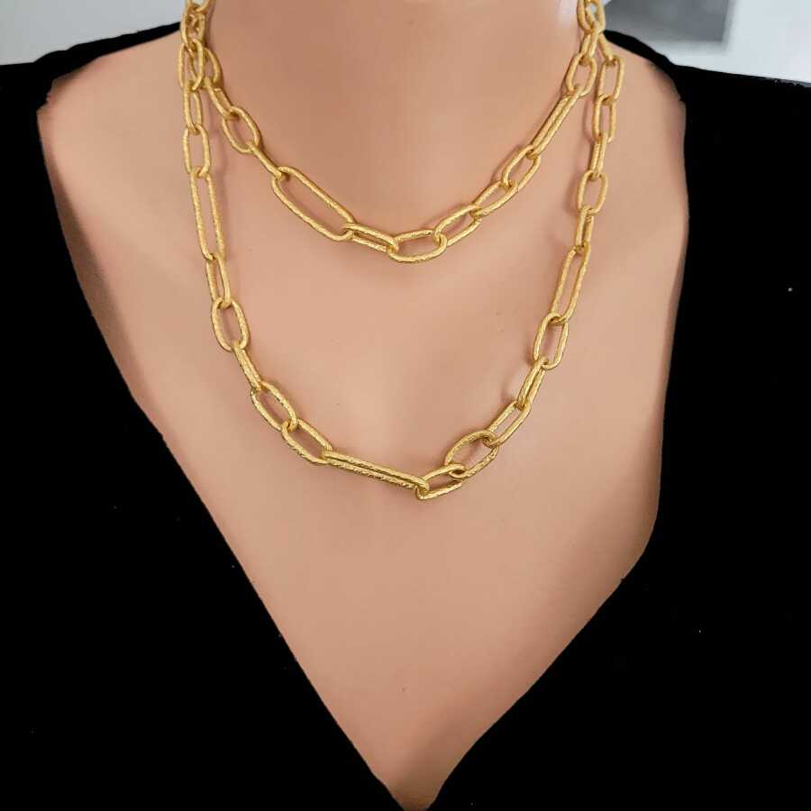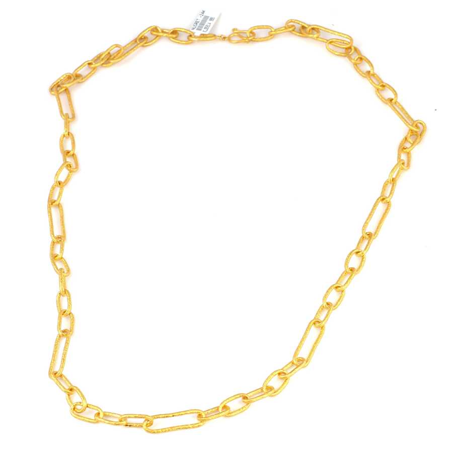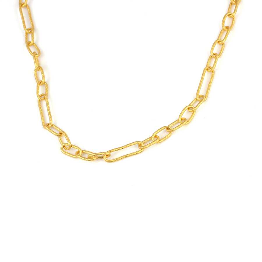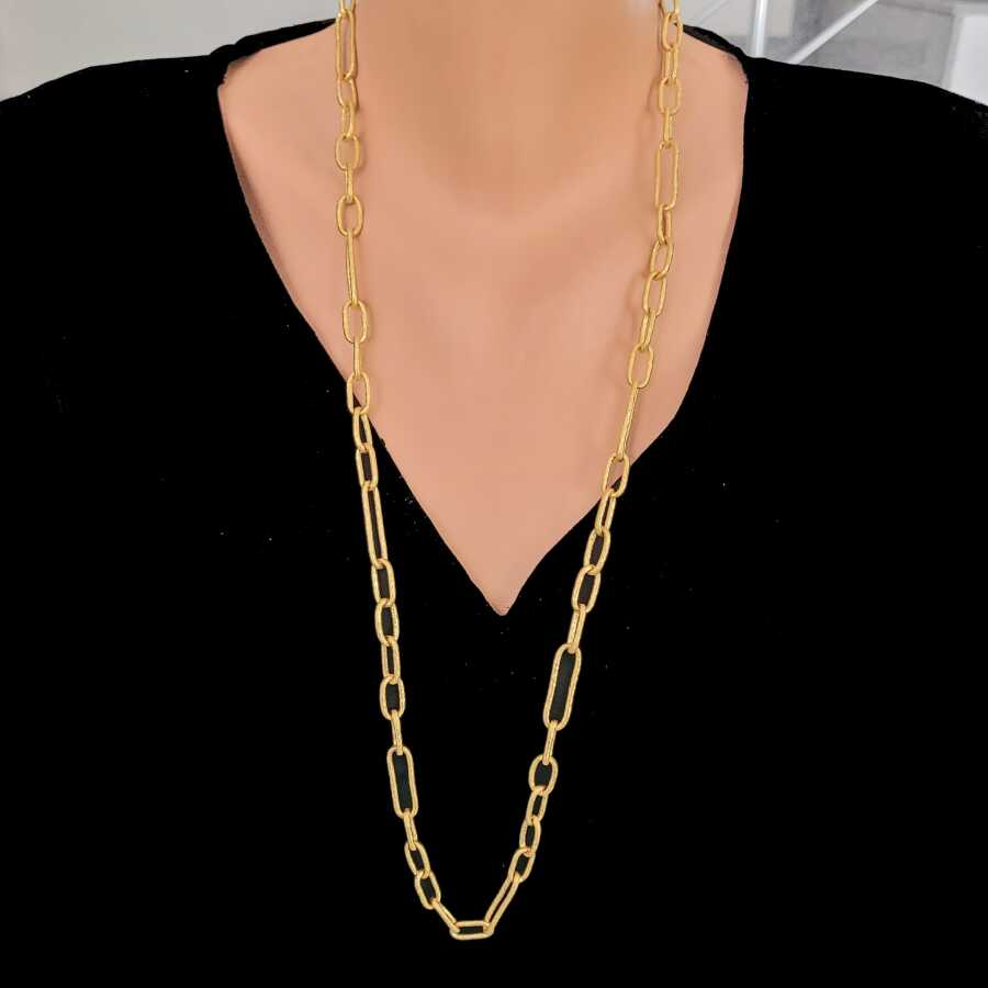 Kolye 24 ayar altından imal edilmiştir. Dövmeli halka kolye 81 cm uzunluğundadır. Kolye 0,8 cm boyutlarındadır. Kolye taşsızdır. Ağırlığı 65,75 gramdır.