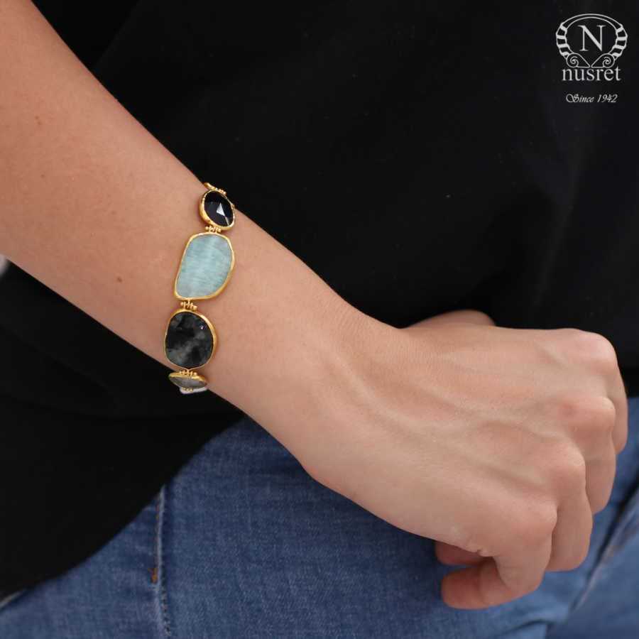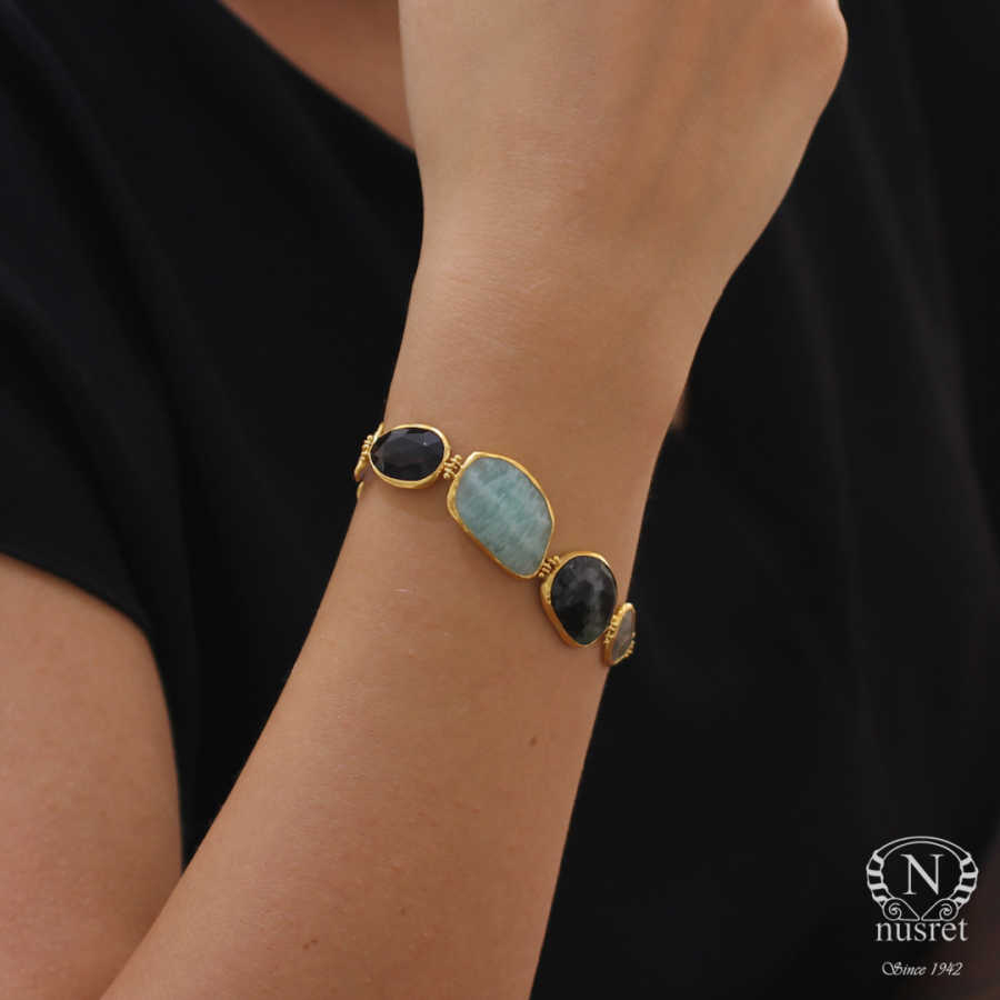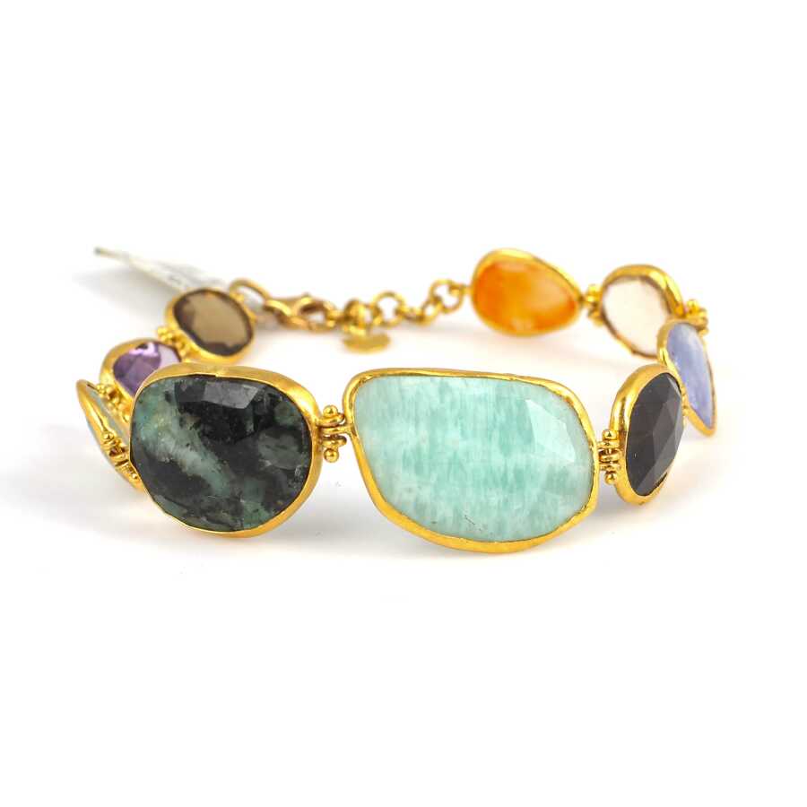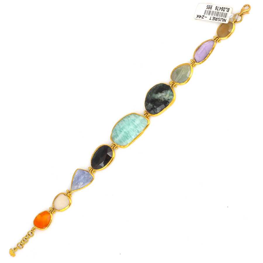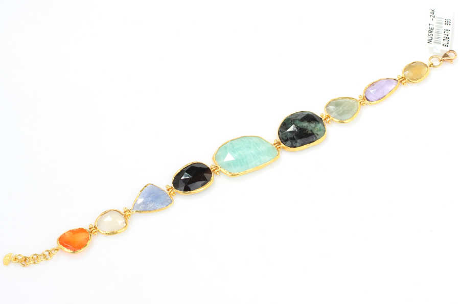 Bileklik 24 ayar altından imal edilmiştir. Karışık doğal taşlardan oluşan bileklik 20 cm uzunluğundadır. Bileklik spessartite, kuvars, tanzanayt, beryl, amazonit, turmalin, peridot, ametist ve topaz taşlıdır. El işi bileklik 15,58 gram ağırlığındadır.