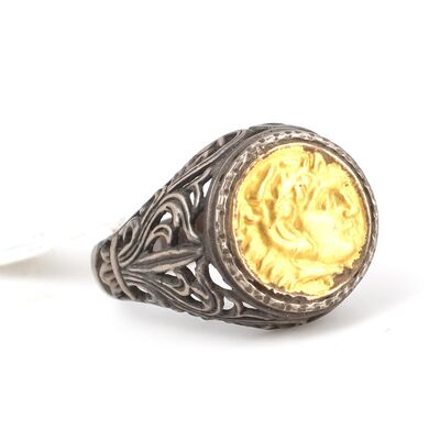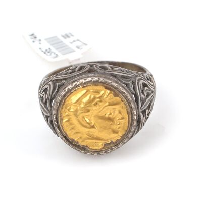 24 ayar altın ve 925 ayar gümüş yüzük ölçüsü: 22 x 1,8 cm`dir. Gümüş yüzük, altın resimlidir. Gramı: 0,51