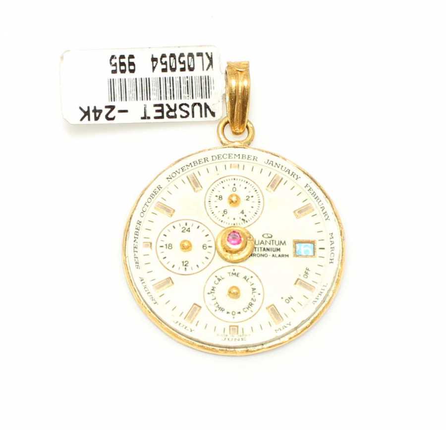 Gelince Haber Ver24 ayar altın, 4 cm gümüş astar üzerine orijinal saat kadranı kullanılarak çevresi 24 ayar has altınla kaplanmış kolye ucu Gramı: 2,4 gr