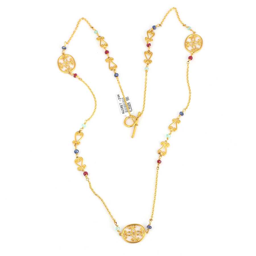 Gelince Haber Ver Altın kolye 24 ayar altından üretilmiştir. El işi desenli uzun kolye 72 cm uzunluğundadır. İster çift sıra ister tek sıra olarak kullanabilirsiniz. Kolye has yakut, zümrüt ve safir taşlıdır. Ağırlığı 25,61 gramdır. Verilen gramlar yaklaşıktır, değişebilir.