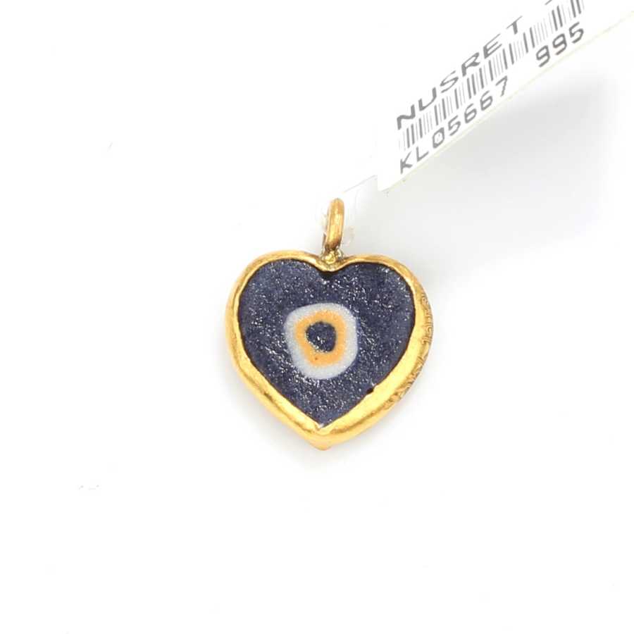 Kolye ucu 24 ayar altından üretilmiştir. Tamamı el işi olan kalp kolye ucu 1,5 cm'ye 1,3 cm boyutlarındadır. Minik göz boncuğu şeklindeki kolye ucunun etrafına 24 ayar has altın çevreleyerek tasarlanmıştır. Zincir dahil değildir. Kolye ucu 0,55 gram ağırlığındadır.
