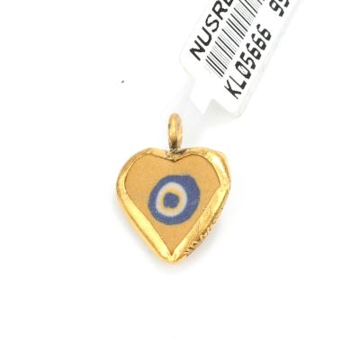 Kolye ucu 24 ayar altından üretilmiştir. Tamamı el işi olan kalp kolye ucu 1,6 cm'ye 1,2 cm boyutlarındadır. Minik göz boncuğu şeklindeki kolye ucunun etrafına 24 ayar has altın çevreleyerek tasarlanmıştır. Zincir dahil değildir. Kolye ucu 0,55 gram ağırlığındadır.
