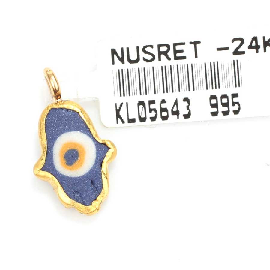24 ayar altındır. Kil üzerine elişi çalışılmış kalp şeklinde nazar boncuğu sembolünün kenarlarına 24 ayar has altından bant çevirme yapılmıştır ebadı: 1,8 x 1 cm dir. Gramı: 0,4 gr