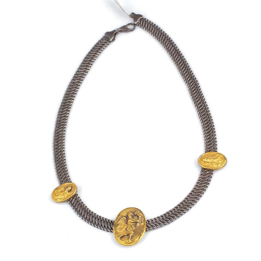 925 ayar gümüş ve 24 ayar altının bir arada kullanılmasıyla tasarlanmış kolyedir. Viyana gümüş zinciri üzerine Hz. İsa, Eros ve Meryem Ana figürleri eklenmiştir. Kolye 46,5 cm uzunluğundadır. Kolye taşsızdır. Viyana zinciri kolye 2,35 gram ağırlığındadır.