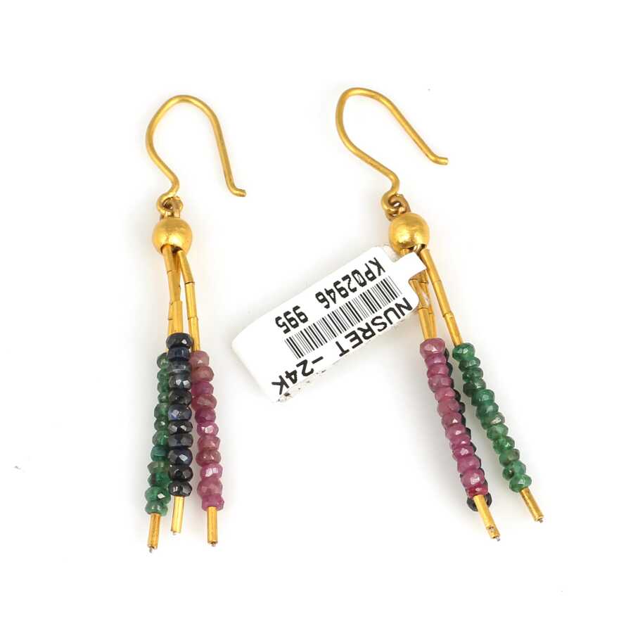 24 Ayar Altın Yakut, Zümrüt Safir Taşlı Sallantılı Küpe