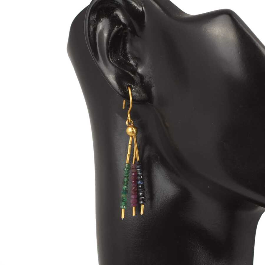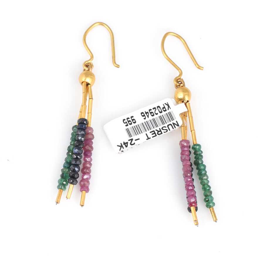 Altın küpe 24 ayar altından üretilmiştir. Sallantılı model küpe 5,8 cm boyutlarındadır. El işi küpe yakut, safir ve zümrüt taşlarından oluşmaktadır. Ağırlığı 5,68 gramdır. Verilen gramlar yaklaşıktır, değişebilir.