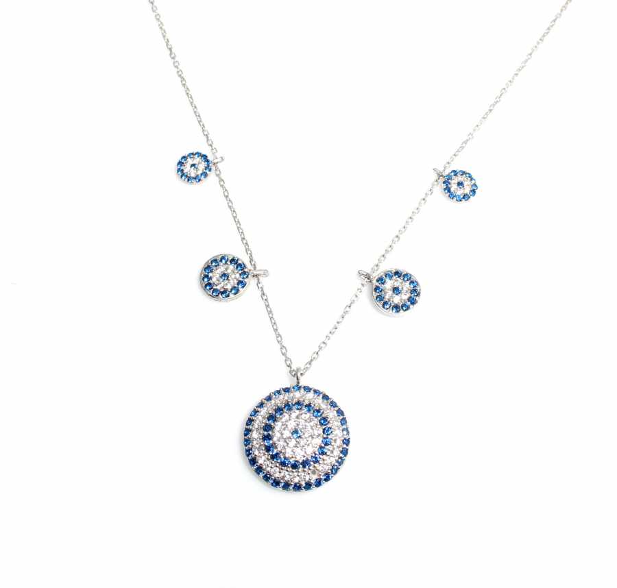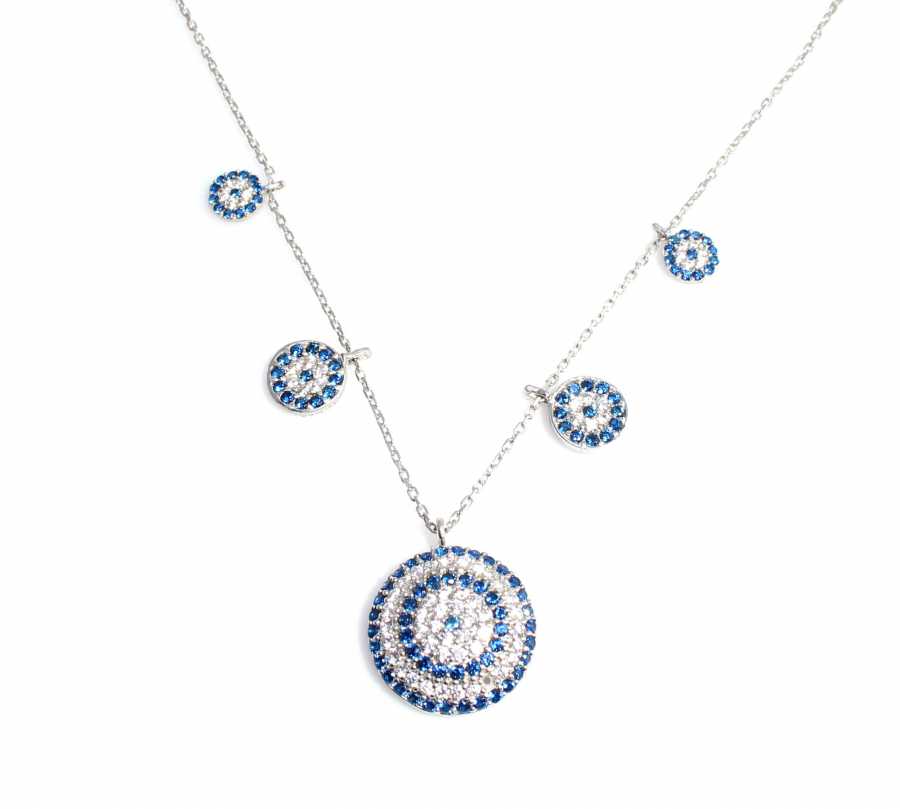 Gümüş kolye 925 ayar gümüşten yapılmıştır. Nazar boncuğu şeklinde şans kolye 1,5 cm boyutlarındadır. Kolyenin kenarlarındaki nazar boncuğu 0,8 cm boyutlarındadır. Zinciri 41 cm uzunluğundadır. Kolye zirkon taşlıdır. Ağırlığı 4,02 gramdır.
