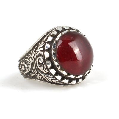 Yüzük 925 ayar gümüşten üretilmiştir. Yüzüğün üzerinde el kalemi atılarak tasarlanmıştır. Taşlı yüzük 1,7 cm boyutlarındadır. Resimdeki yüzük 20 ölçüdür, ancak tüm ölçüler özel olarak yapılabilmektedir. Yüzük sıkma kehribar taşlıdır. Ağırlığı 14,73 gramdır.
