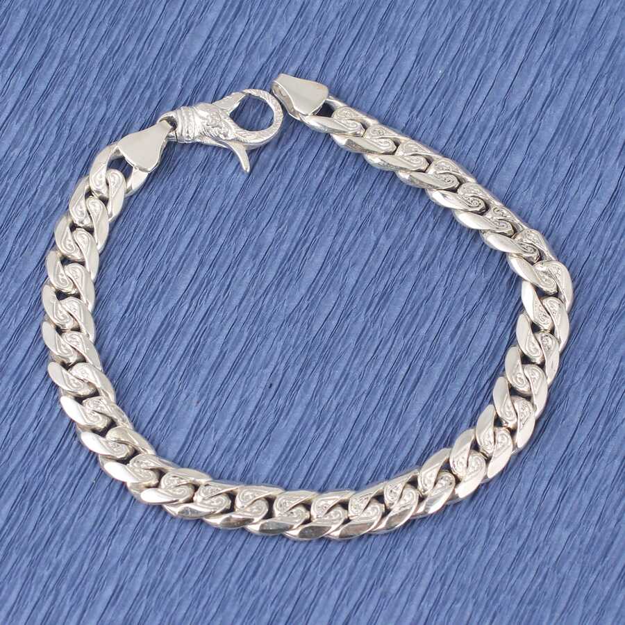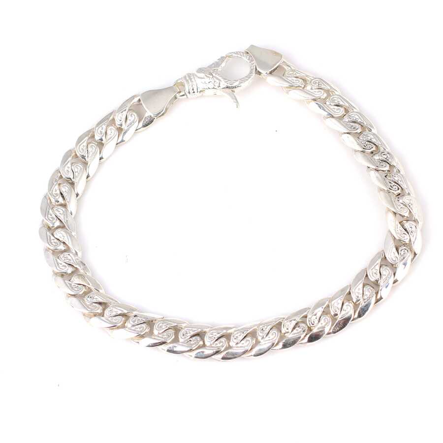 925 ayar gümüştür. 0,75 x 10 mm ebadında halkalardan mamul 20 cm boyunda zincir bilekliktir. Gramı: 21,04 gr