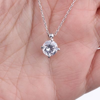 925 ayar Gümüştür. 1,30 ct görünümlü zirkon taşlı dört tırnak beyaz rodajlı 40 + 5 cm zinciri ile birlikte. Gramı 2,33 gr
