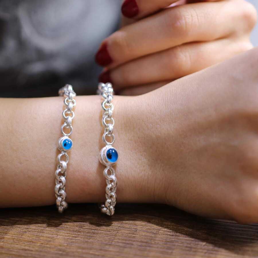 Bileklik 925 ayar gümüşten imal edilmiştir. Göz boncuklu zincir bileklik 20 cm uzunluğundadır. Bileklik 0,7 cm boyutundadır. Bileklik cam göz boncuğu taşlıdır. Ağırlığı 11,71 gramdır.