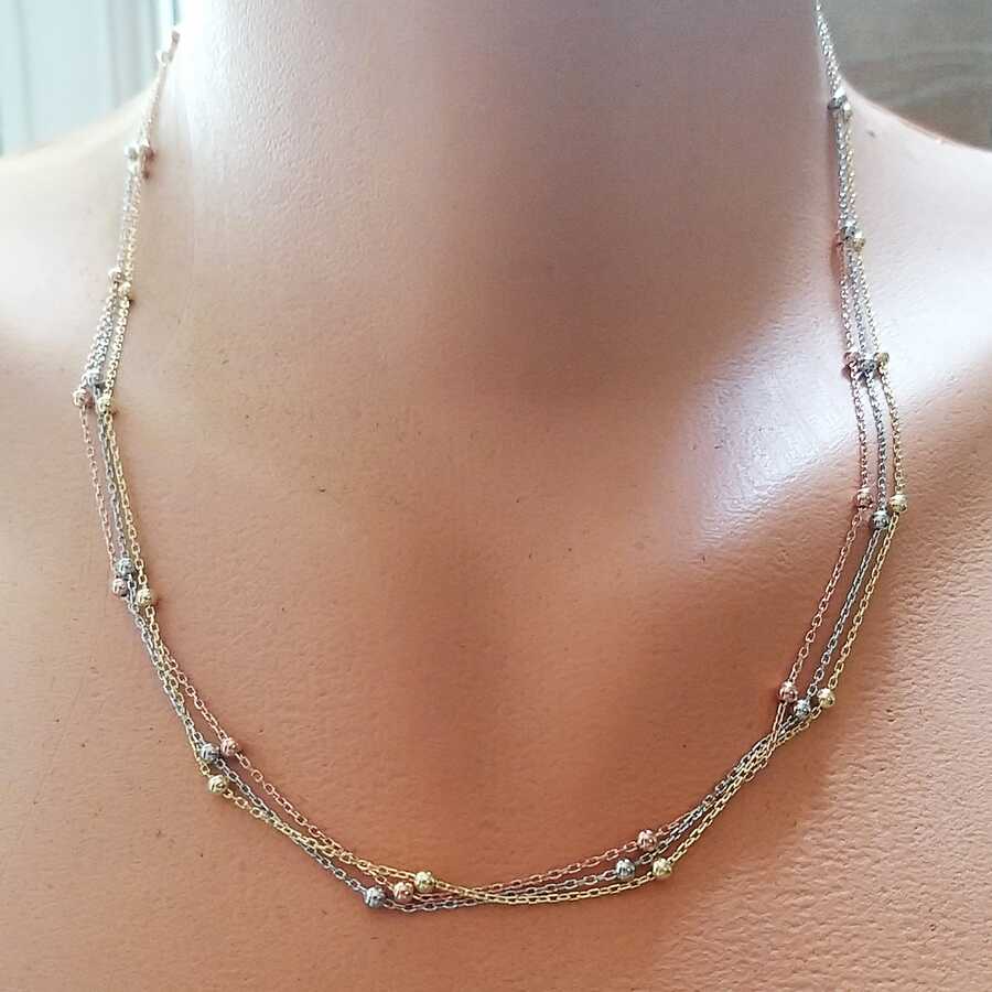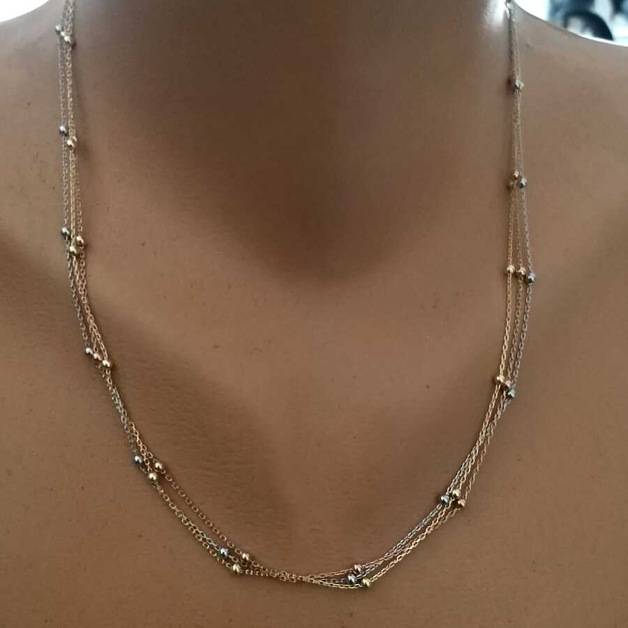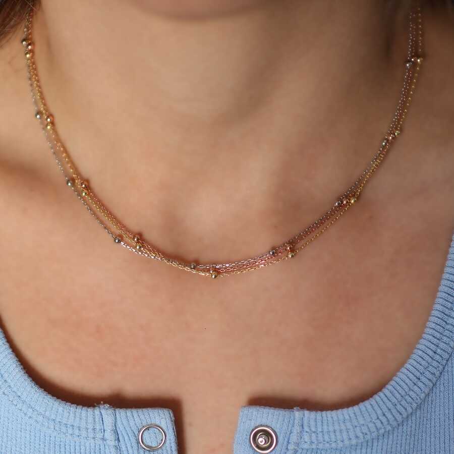 Gümüş kolye 925 ayar gümüşten yapılmıştır. 3 Renk zincir ve aralarında toplar olan zincir kolye 48 cm uzunluğundadır. Kolye taşsızdır. Ağırlığı 4,75 gramdır.