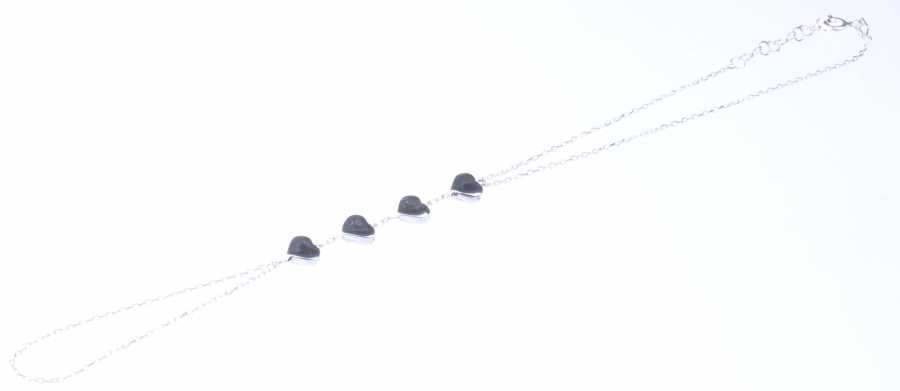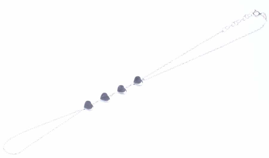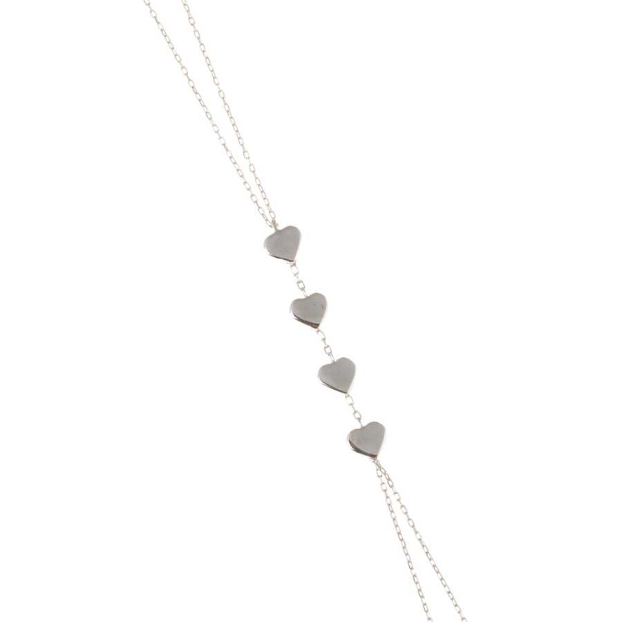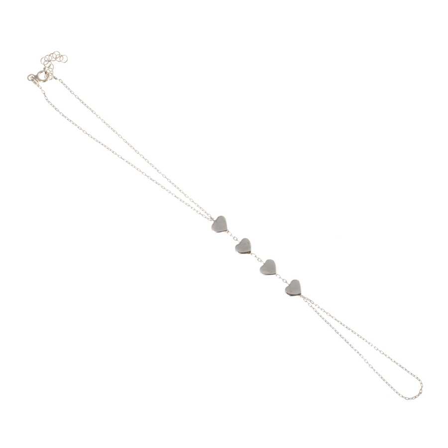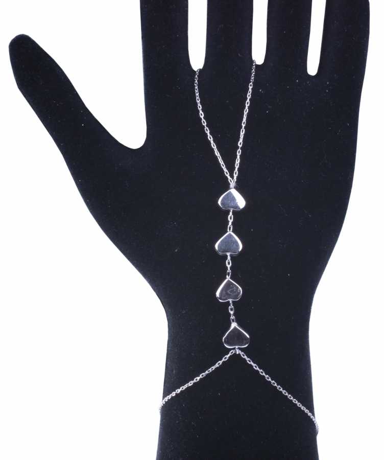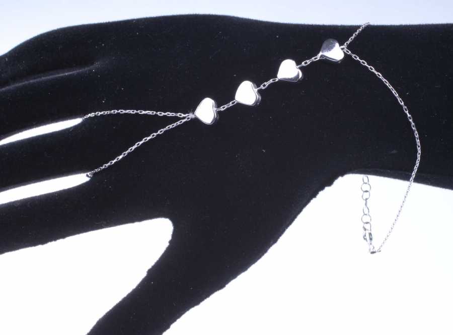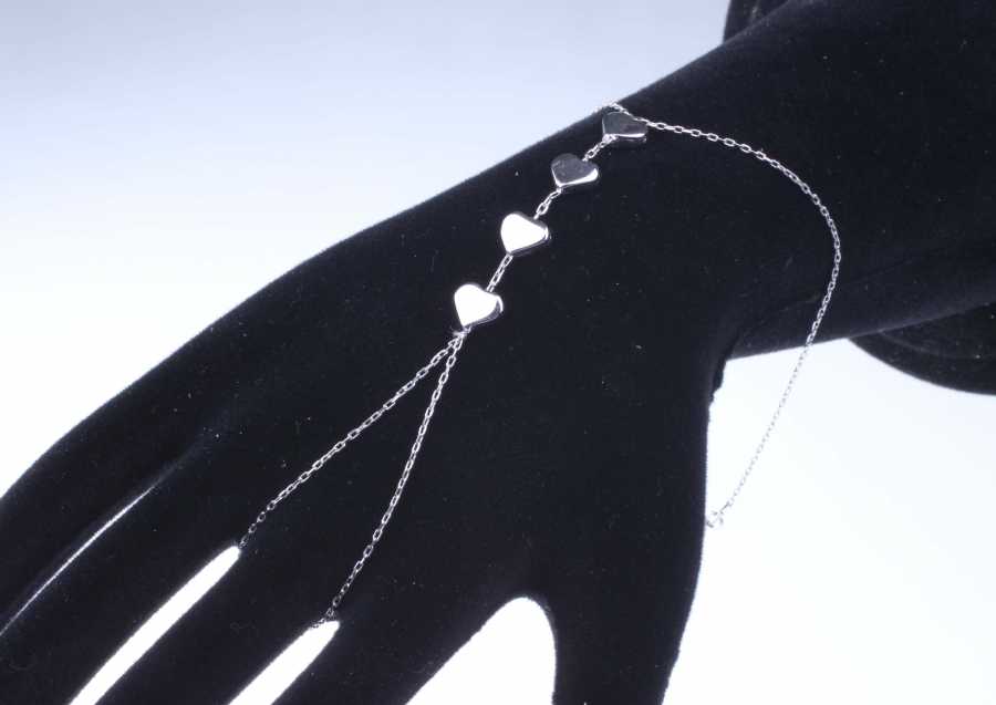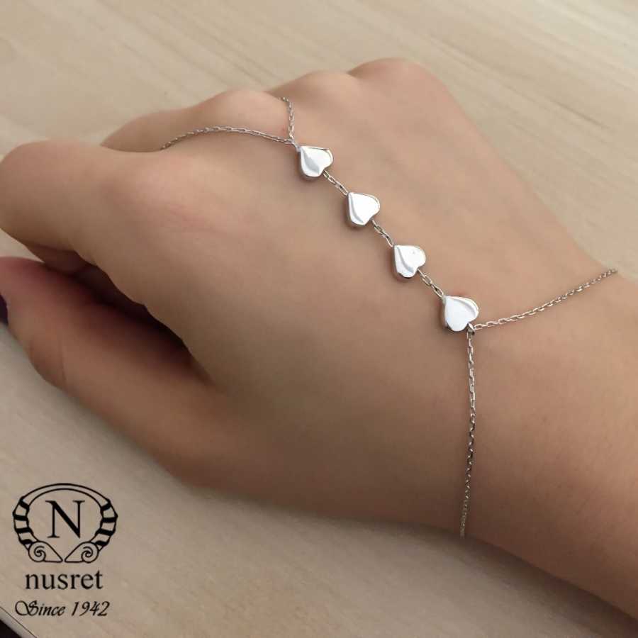 925 ayar gümüştür. Beyaz altın yaldızlıdır. Taşsızdır. 4 adet kalp trend parçalardan imal edilmiştir. Kalp: 0,6 x 0,5 cm , yüzük kısmı zinciri: 11 cm, El üstü uzunluğu: 4 cm, Bilek kısım zinciri: 16 cm + 2,5 cm uzatma - Gramı: 3,32 gr