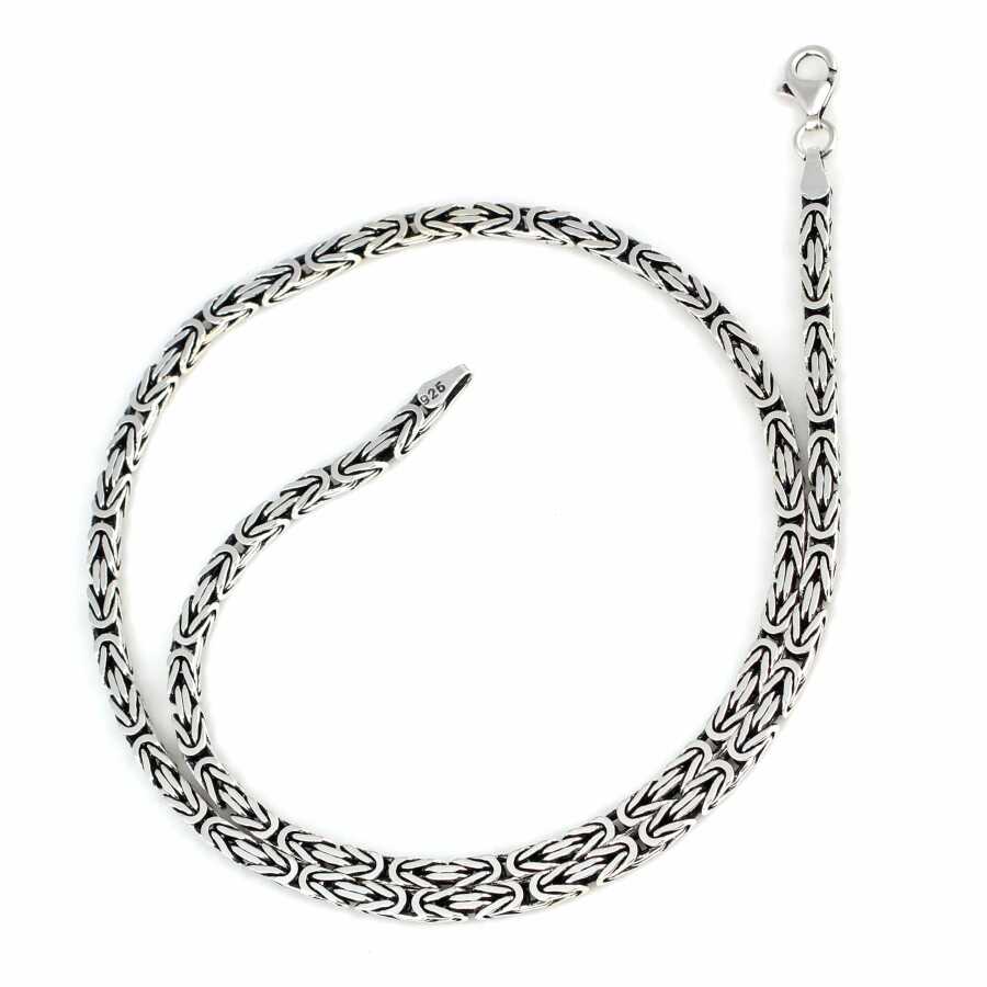 Gümüş zincir 925 ayar gümüşten üretilmiştir. El işi kare kral zincir 4 mm kalınlığında ve 50 cm uzunluğundadır. Kolye taşsızdır. Ağırlığı 43,6 gramdır.