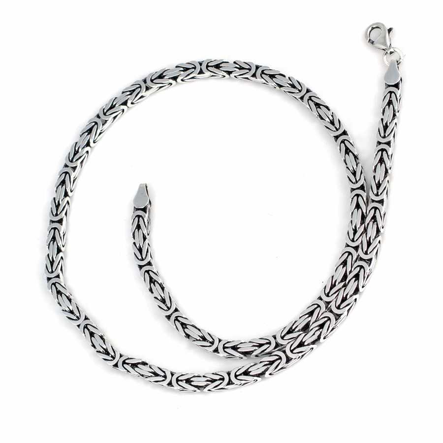 Gümüş zincir 925 ayar gümüşten üretilmiştir. El işi kare kral zincir 5 mm kalınlığında ve 50 cm uzunluğundadır. Kolye taşsızdır. Ağırlığı 62,3 gramdır.