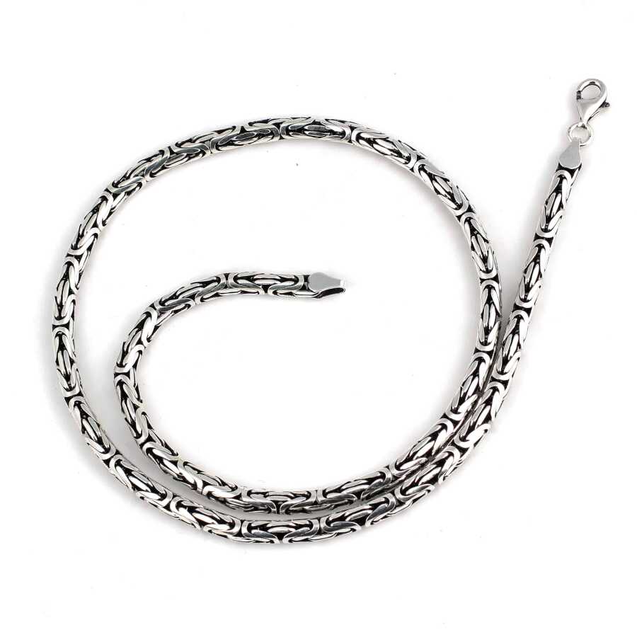 Gümüş zincir 925 ayar gümüşten üretilmiştir. El işi yuvarlak kral zincir 5 mm kalınlığında ve 65 cm uzunluğundadır. Kolye taşsızdır. Ağırlığı 75,8 gramdır.