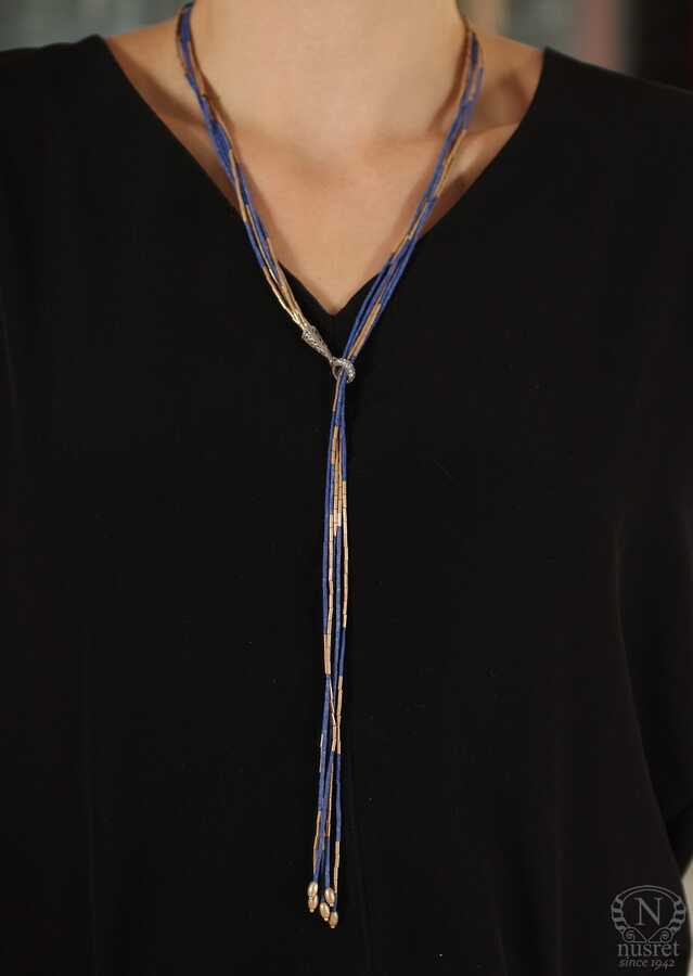 925 Ayar gümüştür. Kolye uzunluğu: 78 cm dir Boyunda duruşu istenilen şekilde ayarlanabilirdir. 5 sıra lapis ve şarnellerden oluşan kolyedir.