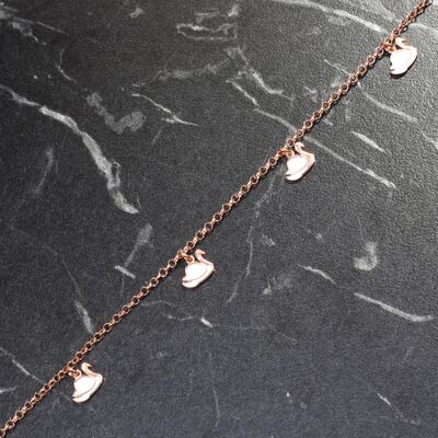925 ayar gümüştür. 25 cm uzunluğunda 6 adet beyaz renkli kuğunun doç zincir üzerinde sıralandırılması ile oluşan, Sarı, Beyaz veya Pembe renklerde imal edilen halhaldır. Gramı: 4,43 gr925 Ayar Gümüş 6 Adet Beyaz Kuğulu Halhal
