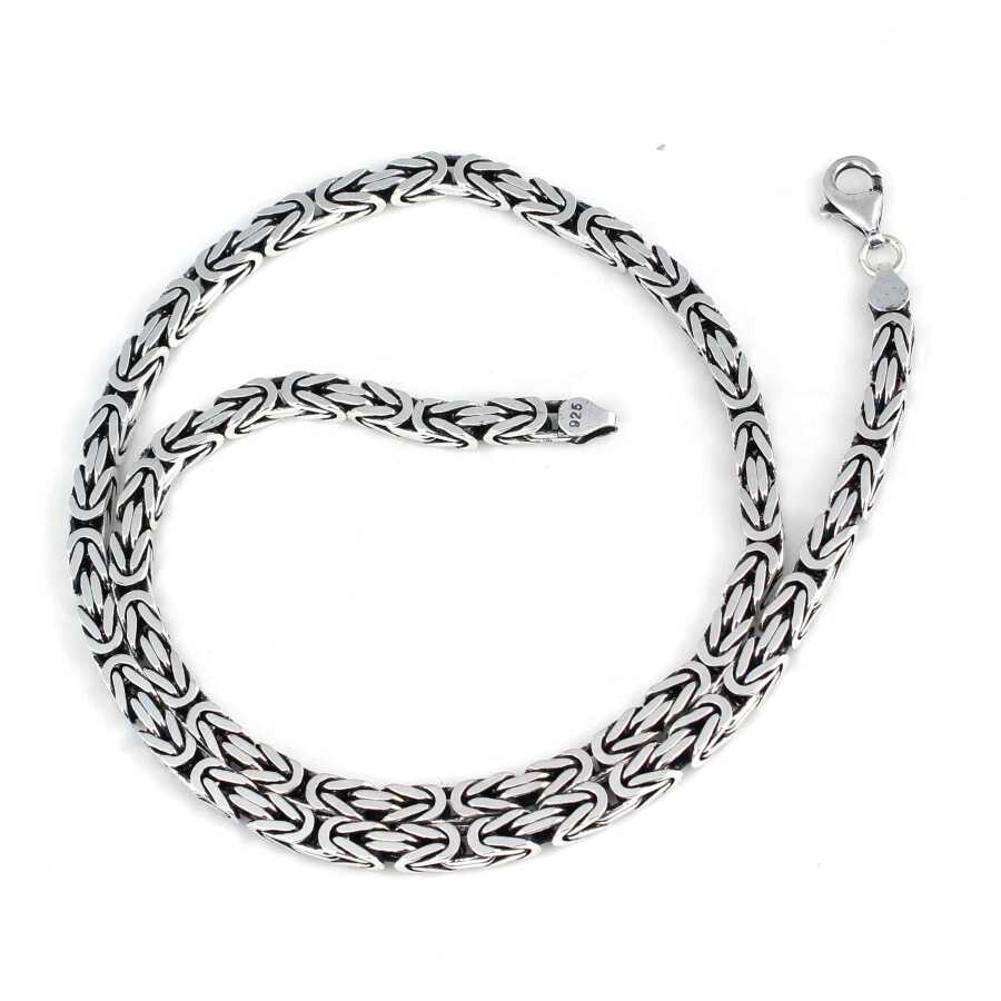 Gümüş zincir 925 ayar gümüşten üretilmiştir. El işi kare kral zincir 6 mm kalınlığında ve 50 cm uzunluğundadır. Kolye taşsızdır. Ağırlığı 84 gramdır.
