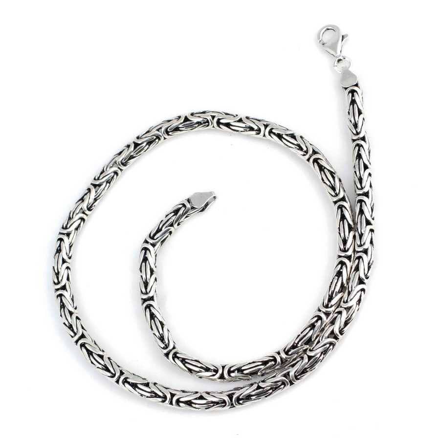 Gümüş zincir 925 ayar gümüşten üretilmiştir. El işi yuvarlak kral zincir 6 mm kalınlığında ve 55 cm uzunluğundadır. Kolye taşsızdır. Ağırlığı 94,1 gramdır.